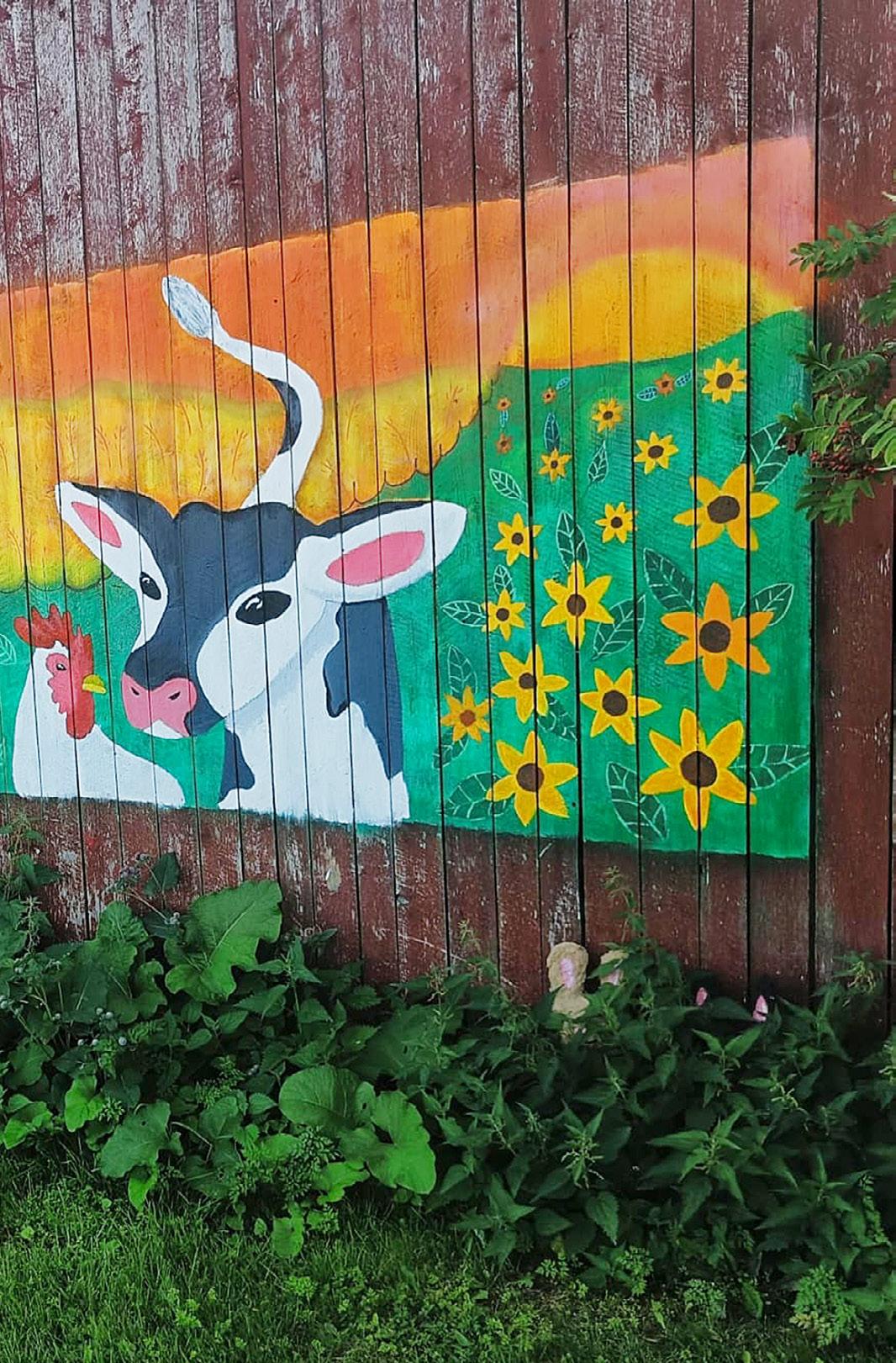 Mäkelän talon pihapiirin ladon seinä. Nyt kylätietä ajavien ilona on hieno värikäs maalaus, jossa lehmä ja kana katselevat maalaismaisemaa.