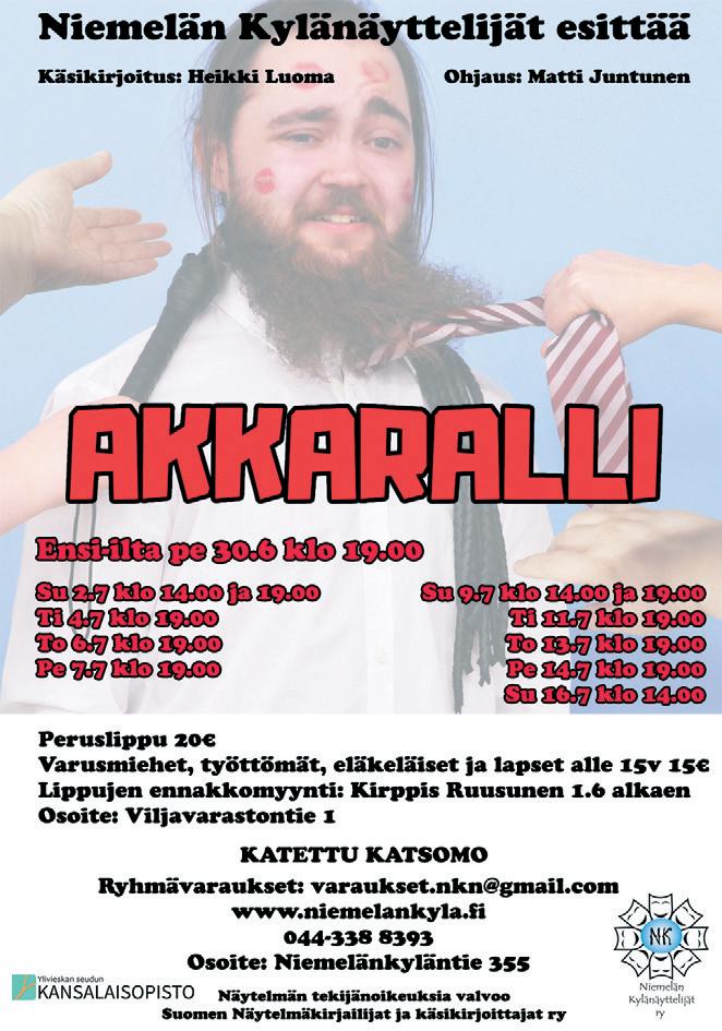 Liput ostetaan ovelta. Ne voi halutessaan varata numerosta 0405663945. Liput 15 €. Maksutavat pankkikortti tai käteinen.