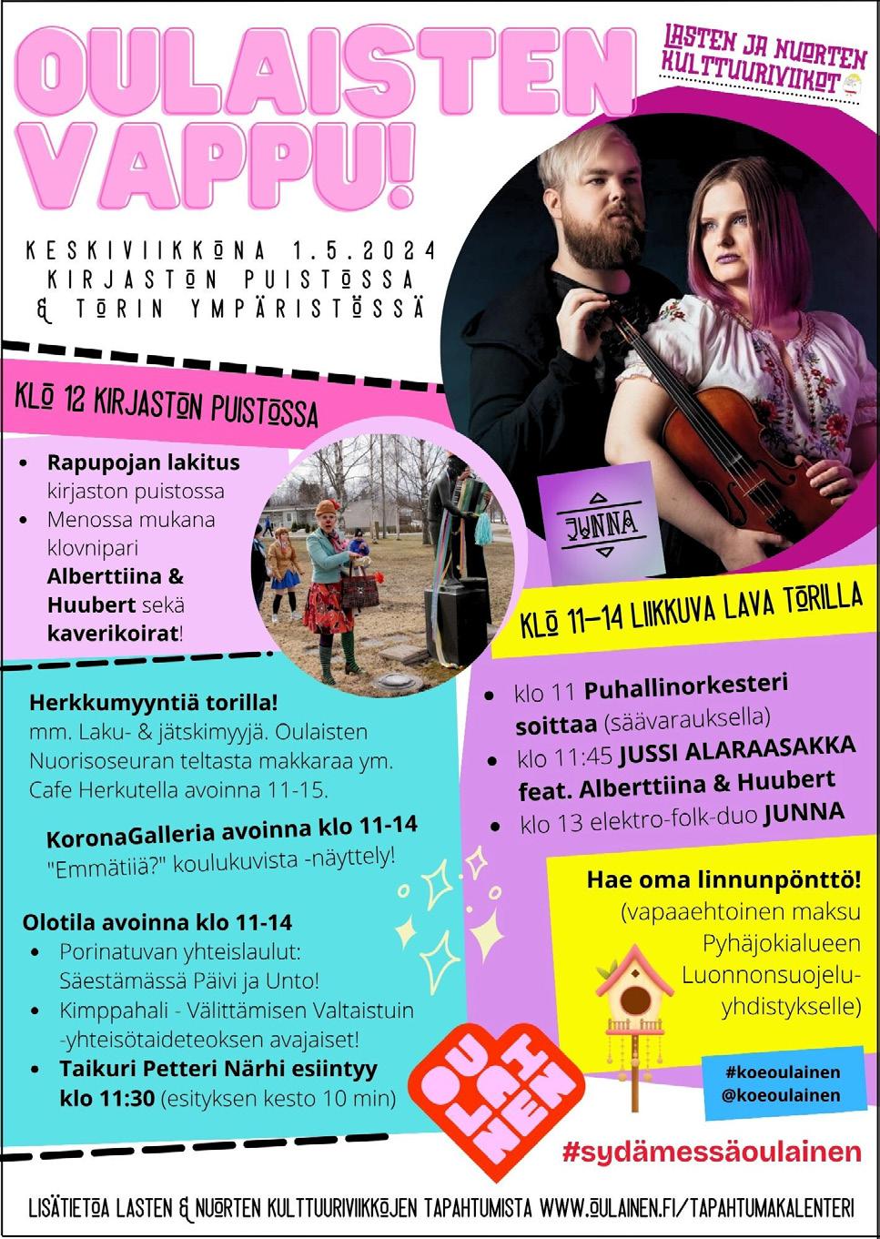 Mari Jussi-Pekka, Heidi Löppönen. Oulaisten Sekakuoro johtaa Anne Huhtala. Rippikouluryhmät 2. ja 3. osallistuu. 70 vuotta tänä vuonna täyttävien syntymäpäiväjuhla