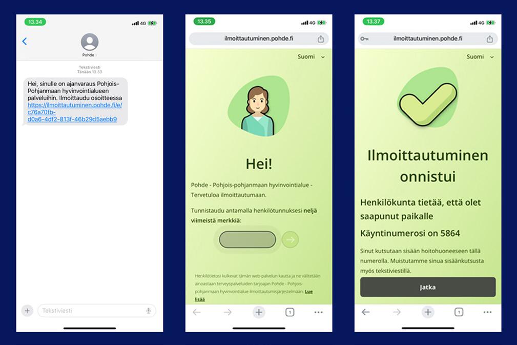 Viestin lähettäjän nimenä lukee ”Pohde”. Viestissä lukee: ”Hei, sinulle on ajanvaraus Pohjois-Pohjanmaan hyvinvointialueen palveluihin”. Linkki johtaa Axel Healthin -järjestelmään. Linkin jälkeen ajanvarauksen ja oikean henkilöllisyyden varmistamiseksi ilmoittautumispalveluun syötetään henkilötunnuksen neljä viimeistä merkkiä. Jos asiakas ilmoittautuu omalla älypuhelimella, tulee hänelle ilmoitus omasta vuorosta samaan laitteeseen.