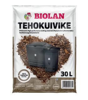 Biolan Tehokuivike tehostaa kompostorin toimintaa ympäri vuoden. Tehokuivike on männyn kuoresta, kuituhampusta, puukuidusta, sammaleesta ja biohiilestä valmistettu kuivike biojätteen kompostointiin.