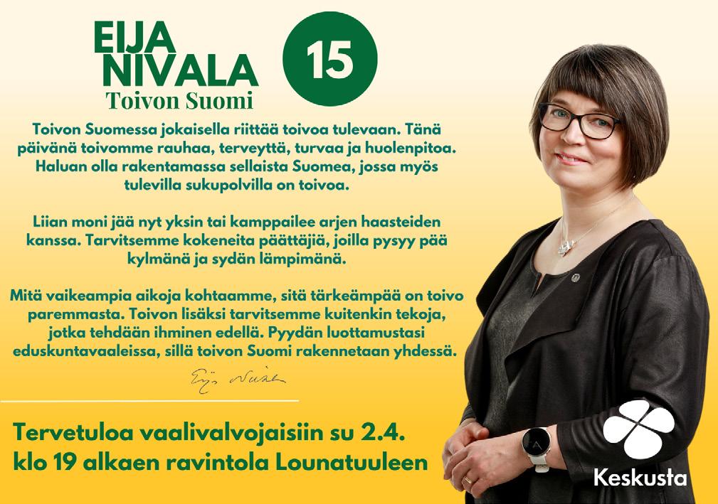 KESKIVIIKKONA 29. MAALISKUUTA 2023 12 MAKSAJA: POHJOIS-POHJANMAAN KOKOOMUS RY. JANNE HEIKKINEN Yhteiskuntatieteiden maisteri, kansanedustaja Oulu 161 MATTI HEIKKINEN Yhteiskuntatieteiden lisensiaatti, yliopettaja Kajaani 162 RIIKKA HUOTARI Kasvatustieteen maisteri, erityisluokanopettaja Sotkamo 163 JUHA HÄNNINEN Majuri evp, teologian maisteri Oulu 164 HANNE-MARI JUNTUNEN Oikeustieteen maisteri, syyttäjä Oulu 165 PAAVO KOHO Lääkäri Oulu 166 MIKKO KORKEAKOSKI Vanhempi konstaapeli Ylivieska 167 JUHA MALINEN Valmentaja Oulu 168 MAARIT MATINOLLI Lääketieteen tohtori, yleislääketieteen erikoislääkäri Tyrnävä 169 SARI NURRO Yhteiskuntatieteiden maisteri, kaupunginhallituksen jäsen Raahe 170 MARI-LEENA TALVITIE Ympäristötekniikan diplomi-insinööri, kansanedustaja Oulu 176 JONNA TAMMINEN Diplomi-insinööri, museo- ja tiedekeskusjohtaja Oulu 177 TUOMO TÖRMÄNEN Teologian maisteri, kirkkoherra Kuusamo 178 MATTI PELTOLA Insinööri (YAMK), lehtori Nivala 171 PAULIINA ROVIO Ensihoitaja (YAMK), projektipäällikkö Vaala 172 JYRI SAASTAMOINEN Apteekkari Paltamo 173 TANJA SUOMALAINEN Filosofian tohtori, yliopettaja Oulu 174 VALTTER TAHKOLA Yrittäjä Kempele 175