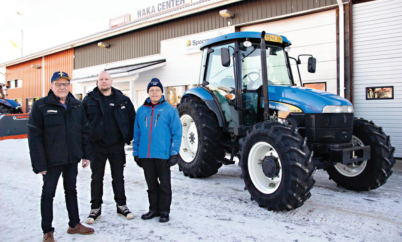 Haka-Centerin konemyyjät Markku Hannola ja Marko Nuolioja sekä Ylivieskan Kuulan Väinö Haapakoski esittelevät Ryskyarpajaisten palkintotraktoria. Voittajan nimi selviää loppuvuodesta tehtävässä arvonnassa.