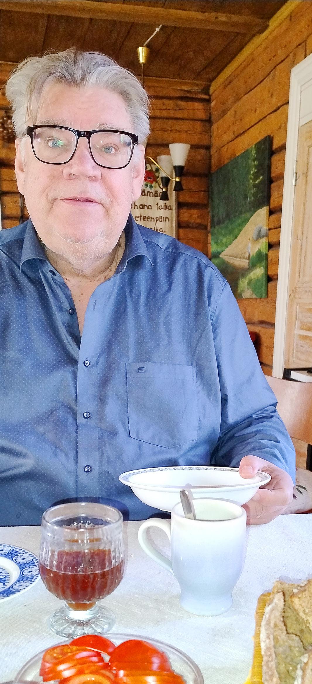 Aktiiviset politiikkavuodet taaksensa jättänyt Timo Soini ehti nauttia aterian ennen illan puhujatilaisuutta Merijärvellä. Kuva: Esa Pikkumäki