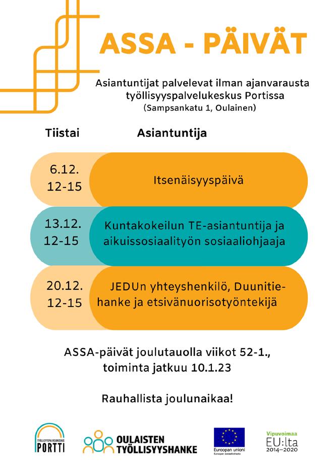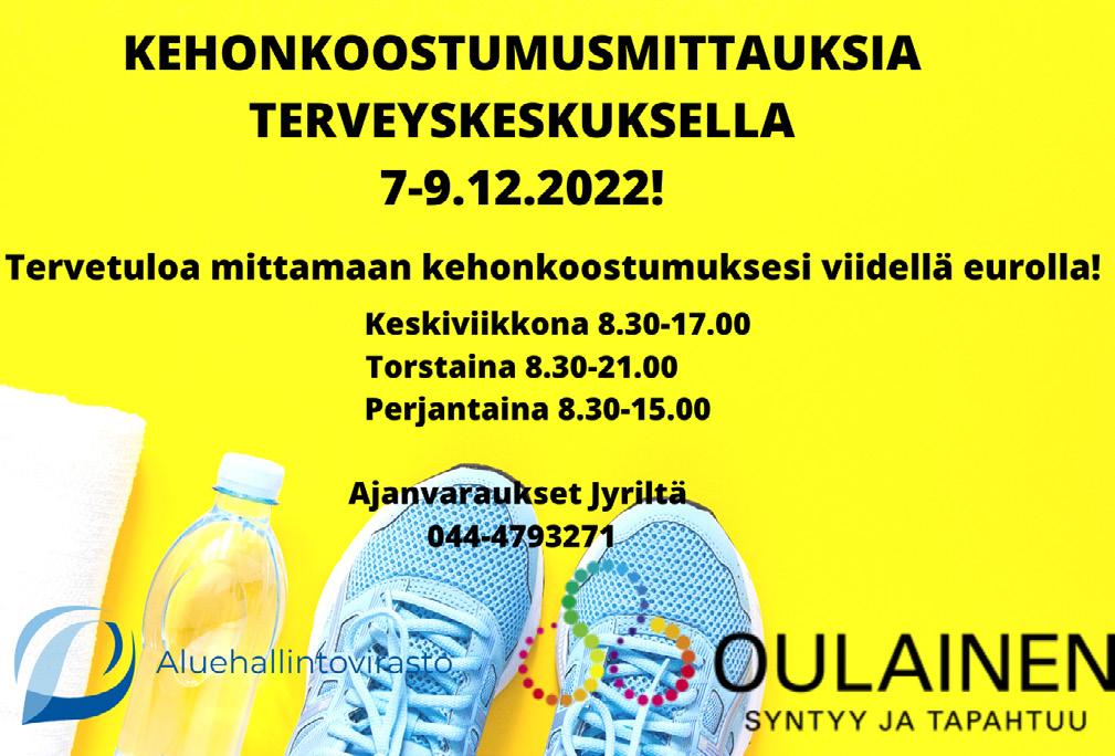 Keskiviikko 30.11.2022 nro. 44 Perustettu 2010 Puh. 0400-304808 / oulaistenhammas.fi OULAISTENKATU 37 L3, 86300 OULAINEN Myös iltaisin! • Hammaslääkärin ja suukirurgin palvelut • Myös ilta-aikoja Hyvinvointia ja terveyttä syksyyn! Kivikaari 5, 86300 Oulainen Joni Puolitaival p. 050 558 7108/joni@metsakonehuolto.net Keijo Kirjava p. 045 2161720/myynti@metsakonehuolto.net 195/65R15 Kapsen Rw506 345,Hankook W429 389,Michelin Xin4 510,205/55R16 Nastarengassarja Kapsen RW506 375,Hankook W429 470,Michelin Xin4 639,MEILTÄ LAATURENKAAT ENSI TALVEKSI Myös raskaankaluston renkaat/ korjaukset • Työkoneet • Maatalous • Kuorma-autot Laadukkaat voiteluaineet ja suodattimet maatalouteen ja koneurakointiin. Kaikki hinnat sisältävät vannetyön, tasapainoituksen ja kierrätysmaksun (alleruuvaus +20€/srj) Valikoimastamme löydät mm. TMtestivoittajan Michelin X-ice4:n ja loistavasti menestyneet Hankook ja Nokian Renkaat • LVI-huollot ja korjaukset • Ilmavesi-, maalämpö- ja ilmalämpöpumput Energiatehokkaat tuotteet laskee sähkönkulutustasi p. 08-479-5600 Oulainen-Haapavesi-Vihanti-Pyhäjoki-Raahe-Merijärvi OULAINEN Oulaistenkatu 15-17, 86300 Oulainen, puh. 08 4797 300 miku.siljander@k-supermarket.fi Palvelemme MA-PE 7-22, LA 8-21 ja SU 10-21 Ilman Plussa-korttia 1,95 tlk 3 50 6 99 TUORE SUOMALAINEN KIRJOLOHI Kasvatettu, Suomi Rajoitus 2 kalaa/talous PUNAINEN ja VAALEA GLÖGI 1 l (1,75/l) KG Tavallista parempi joulun ruokakauppa Voimassa TO-MA 1.-5.12. 2 TLK SUOMI -10 % Plussa-etu LUE TARJOUSLEHTEMME MYÖS DIGINÄ HINNAT VOIMASSA TO-TI 1.-6.12.2022. ELLEI TOISIN MAINITA. Tarjoustuotteita rajoitettu määrä. KATSO OMAN KAUPPASI HERKKUTORIN PALVELUAJAT k-supermarket.fi JOULUBRITA RESEPTI K-RUOKA.FI/RESEPTIT TAI K-RUOKA-SOVELLUS Ilman Plussa-korttia 3,79 rs (9,48/kg) Snellman MAATIAISPOSSUN LIHASUIKALEET 400 g (8,48/kg) 3 39 RS Kokkikartano JOULULAATIKOT 650-700 g (7,70-8,29/kg) 5 39 RS PERUNA 1 kg, Suomi, kiinteä, jauhoinen tai yleisperuna 0 59 PS Fazer SININEN MAITOSUKLAA 200 g (9,95/kg) 1 99 KPL KRYSANTEEMIKIMPPU Hollanti 8 90 KIMPPU SINIVALKOISEN MAKUJA -10 % Plussa-etu Ilman Plussa-korttia 2,55 kpl (12,75/kg) -21 % Plussa-etu PIZZAPERJANTAI klo 10-18! Viikon erikoispizzana Tuplajuustosalami-pekonipaprikamajoneesi Itsenäisyyspäivän vuoksi 7.12. lehteen tulevat aineistot viimeistään perjantaina 2.12. klo 16 mennessä.