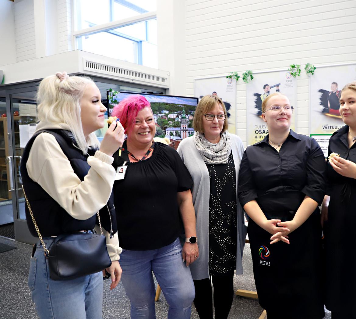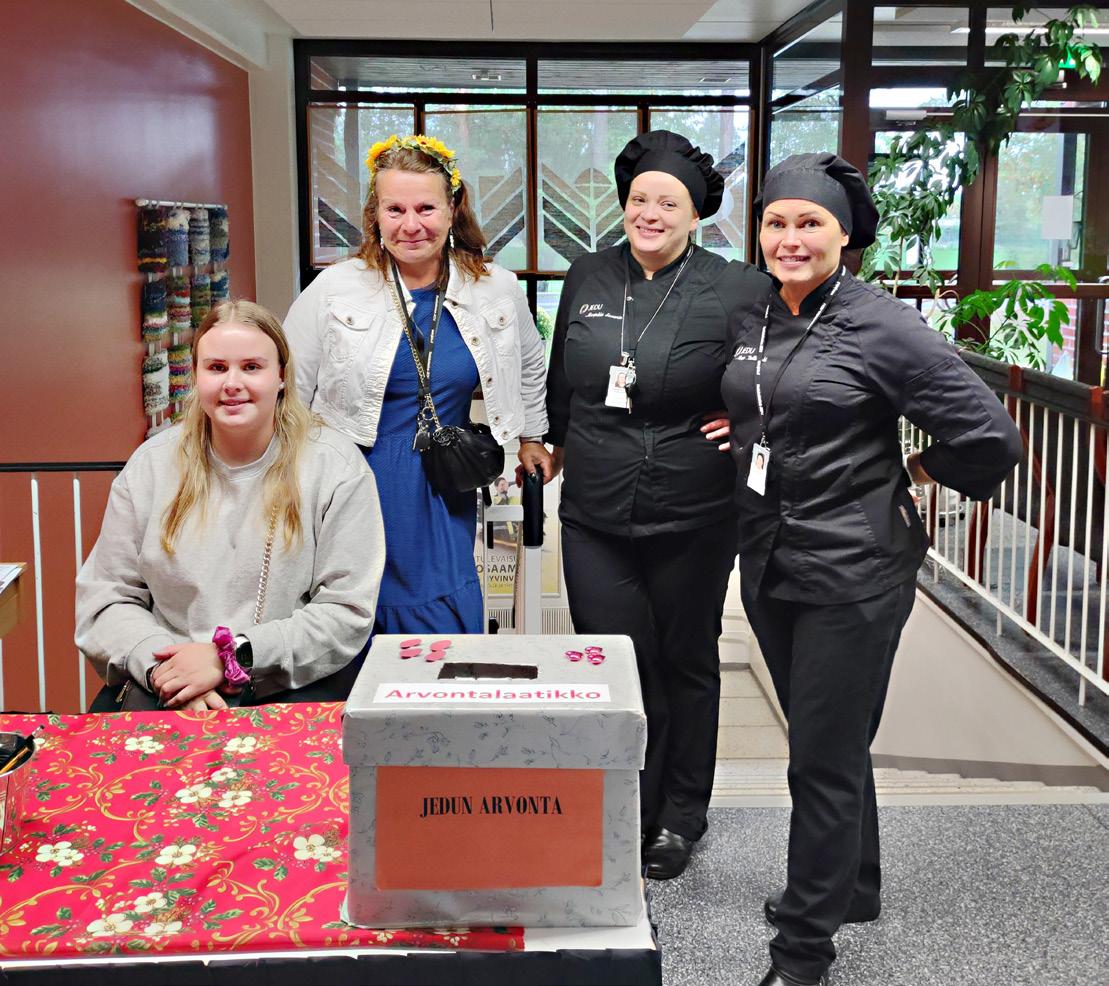 Oppilas Oona Oksanen, liiketalouden opettaja Tiina Kiviranta, ravintola-, ja catering-alan opettajat Sari Hauhtonen ja Merja Kalliokoski.