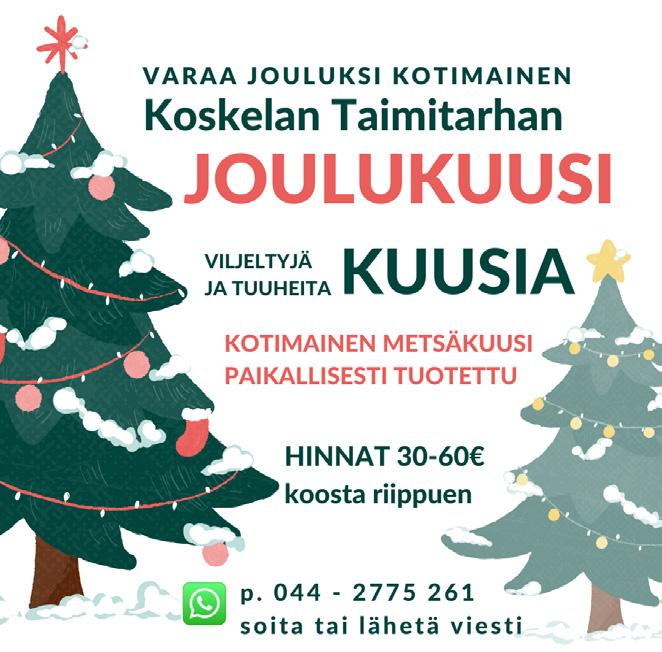 12900 690 6500 41900 489€ 8,90€ MYÖS MUITA PITUUKSIA 1,8M, 2,4M, 2,7M KYLPYHUONEKALUSTEIDEN MALLISTO VAIHTUU, NYT LOPUT MALLIKALUSTEET -50%! JOULUKUKAT SAAPUNEET OULAINEN 3 29 RS 5 50 Saarioinen RUUKUT ja KULHOT 300 g (9,17/kg) Kulhot Vain K-kaupoista Ilman Plussa-korttia 3,39 kpl (11,30/kg) Ilman Plussa-korttia 4,39 pkt (10,98/kg) Ilman Plussa-korttia 3,89 rs (3,73/kg) Ilman Plussa-korttia 3,79 rs (9,48/kg) Kultamuna VAPAAN KANANMUNIA 18 kpl/1044 g (3,15/kg) Rajoitus 2 rs/talous Grandiosa EXTRAKIVIUUNIPIZZAT 400 g (10,00/kg) 8.Snellman MAATIAISPOSSUN LIHASUIKALEET 400 g (8,48/kg) 3 99 RS 2 KPL 2 PKT JAUHELIHALINSSIKEITTO RESEPTI K-RUOKA.FI/RESEPTIT TAI K-RUOKA-SOVELLUS 5 99 PS NAUDAN JAUHELIHA 10 % 600 g (9,98/kg) -15 % Plussa-etu -18 % Plussa-etu -8 % Plussa-etu -10 % Plussa-etu Tavallista parempi joulun ruokakauppa Oulaistenkatu 15-17, 86300 Oulainen, puh. 08 4797 300 miku.siljander@k-supermarket.fi Palvelemme MA-PE 7-22, LA 8-21 ja SU 10-21 KLEMENTIINI 2,3 kg (2,17/kg) Espanja 4 99 LTK 5 PIZZAPERJANTAI klo 10-18! Helpommin kohti JOULUA LUE TARJOUSLEHTEMME MYÖS DIGINÄ k-supermarket.fi/tarjoukset HINNAT VOIMASSA TO-SU 8.-11.12.2022. ELLEI TOISIN MAINITA. Tarjoustuotteita rajoitettu määrä. Lukijapeitto 86 000 kpl 100% JAKELU PEITTOHaapavesi Raahe Vihanti Oulainen Merijärvi Ylivieska Pyhäjoki MEGAJAKELU 14.12.2022 Seutu Majakka Varaa ilmoitustilasi puh: 044-0470 126 ilmoitukset@seutumajakka.fi