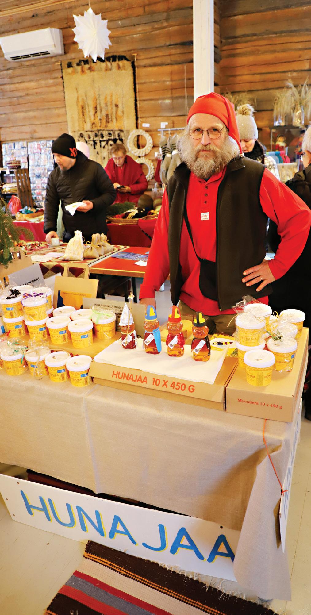 Yksi paikalle oman pöy tänsä pystyttäneistä ihmi sistä on Pelle Leskinen. Hä nen myymien tuotteiden ni meä ei tarvitse kauan miet tiä: pöydän edessä lukee suurin kirjaimin Hunajaa.