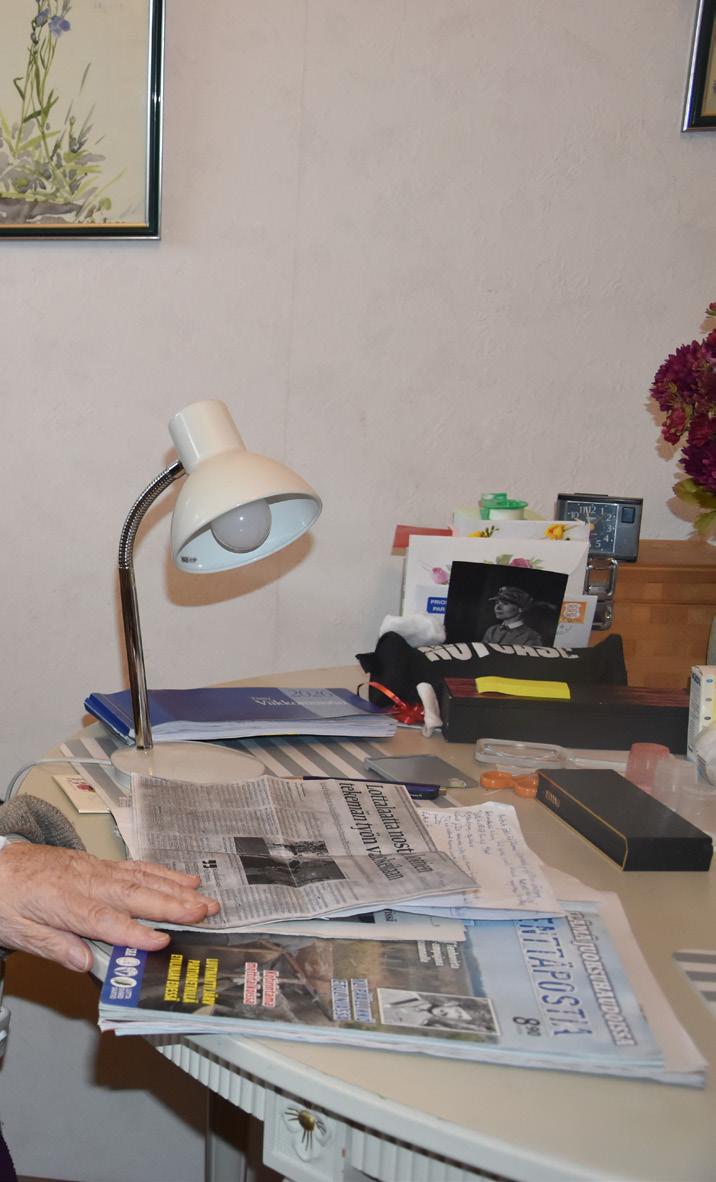 ”Sitten olimme myös lottakahvilassa neljä vuotta, jossa minulla oli työvuoro. Suojeluskuntatalolle kudoimme paljon sukkia. Ensin oli talvisota ja sitten vielä jatkosota päälle. Kun sota loppui, muistan, että kahvia ei saanut mistään, vaan piti juoda korviketta. Kaikki