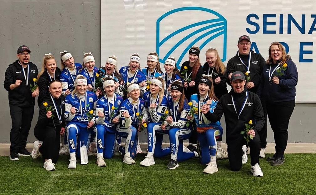 Ilona Kankaanpää (alarivissä toinen vasemmalta) oli mukana Oulun Lipon B-junioreiden joukkueessa, joka voitti Talvisuperin SM-hopeaa Seinäjoella. Kuva: Ilona Kankaanpää