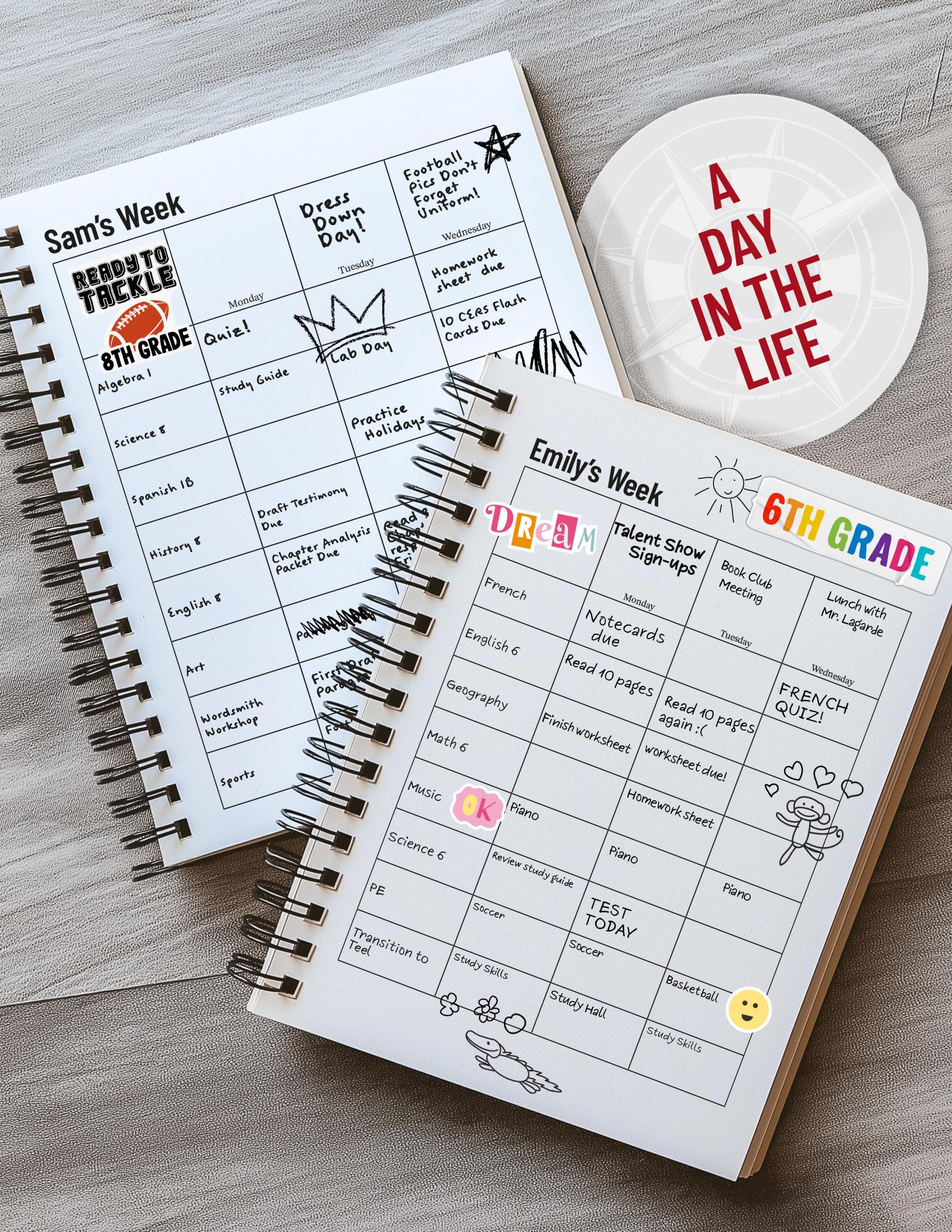 8:00–8:10 Advisory 8:10–9:10 Period 1 9:10–10:10 Period 2 10:10–10:25 Break 10:25–11:25 Period 3 11:25–12:00 Lunch 12:00–1:00 Period 4 1:00–1:30 FLEX 1:30–2:15 Period 7 (PE for 6th grade) 2:15–3:00 Period 8 elective for 6th grade, dismissal at 3pm 2:15–3:30