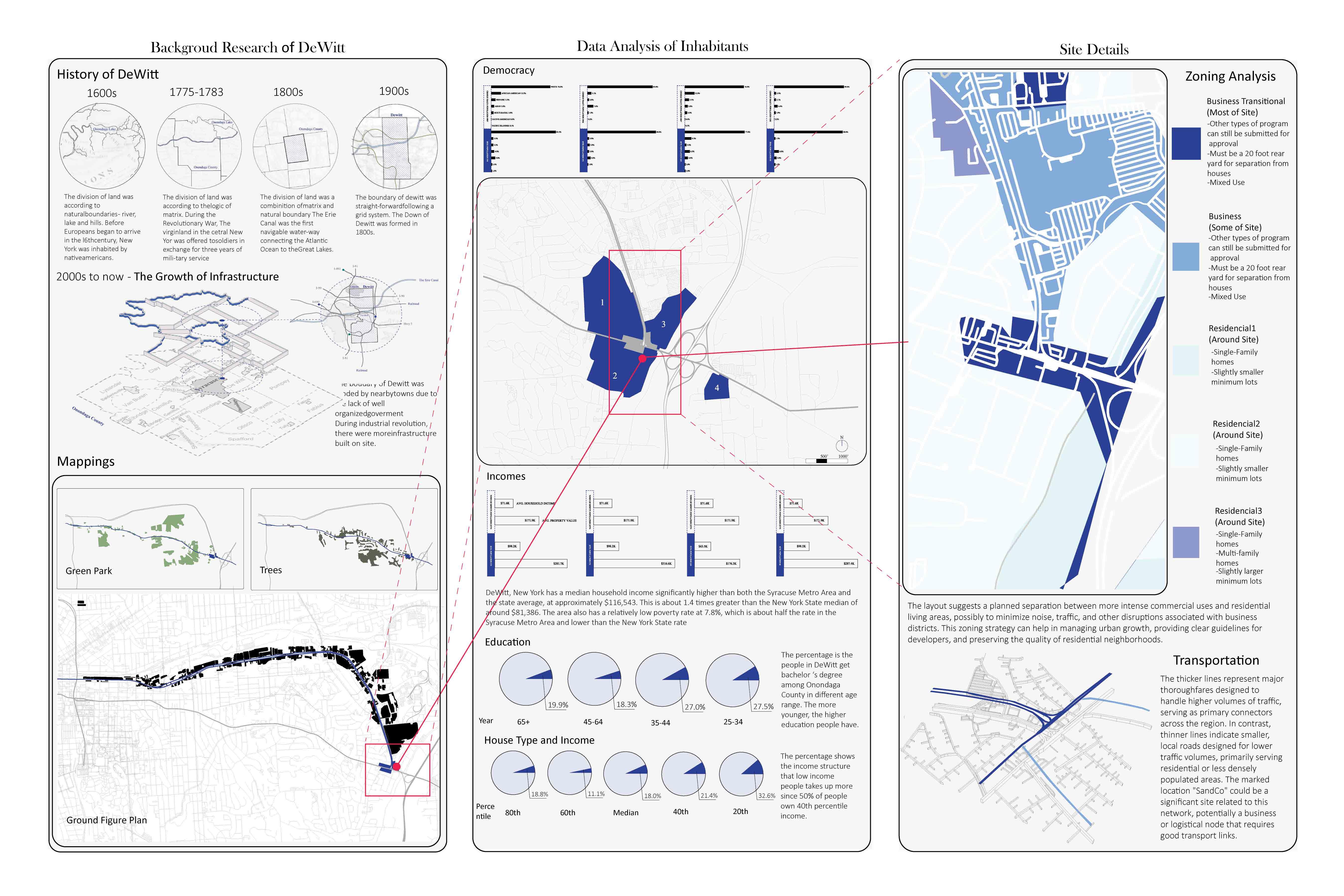 Dewitt’s suburban landscape, characterized by its car-centric design and isolated commercial developments, presents a unique opportunity for architectural introspection and innovation. By embracing the lessons from Robert Venturi and Denise Scott Brown’s ‘Learning from Las Vegas,’ this project seeks not only to understand Dewitt’s specific urban form but also to transform it. The goal is to move beyond traditional designs and towards a more integrated and responsive urban environment. By reevaluating and creatively adapting the existing architectural vernacular, we can develop spaces that are not only more functional but also more engaging for the community. This approach promises a future where the built environment in suburban settings like Dewitt is both reflective of its inhabitants’ needs and conducive to fostering a vibrant and cohesive urban life.