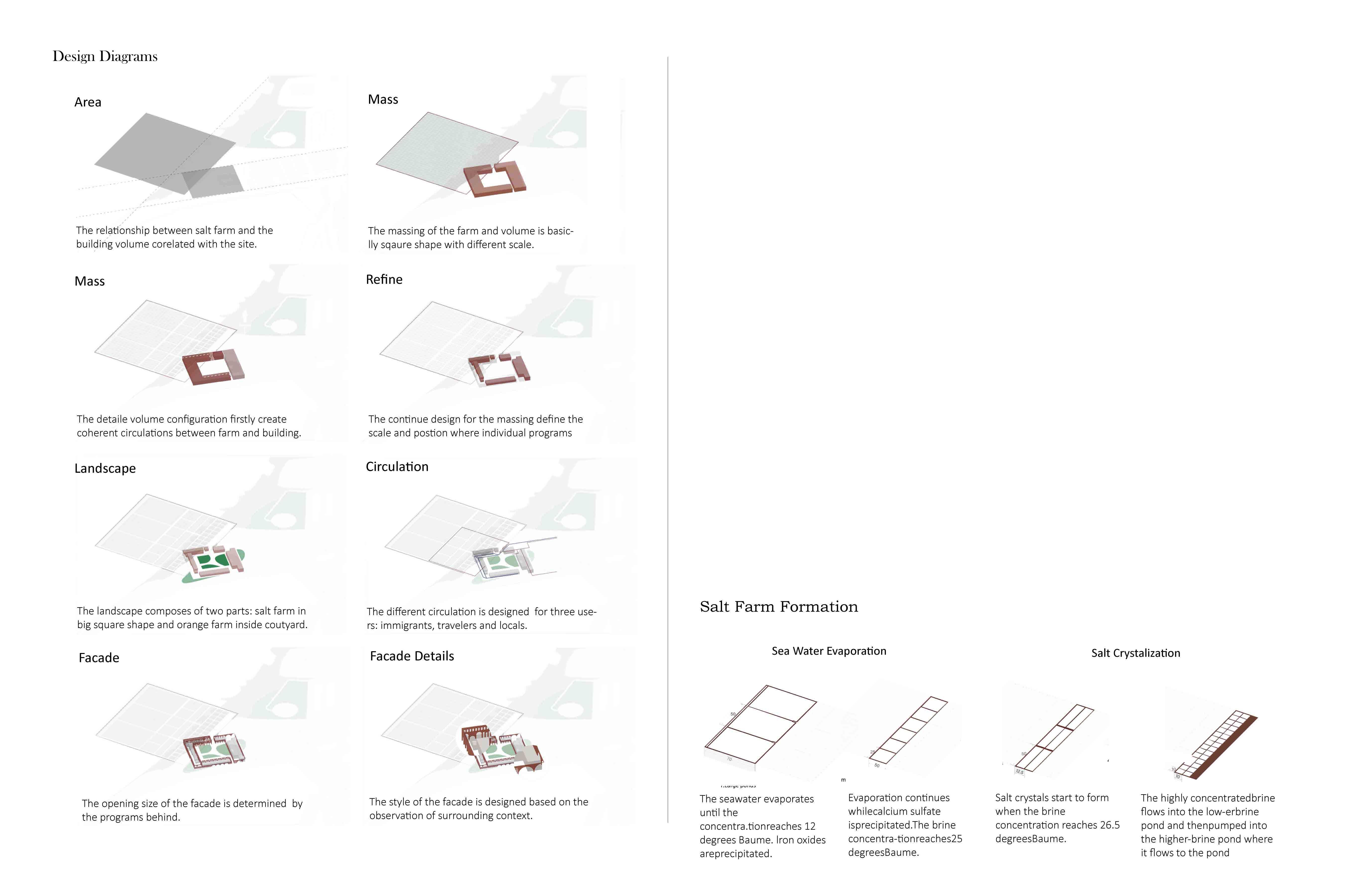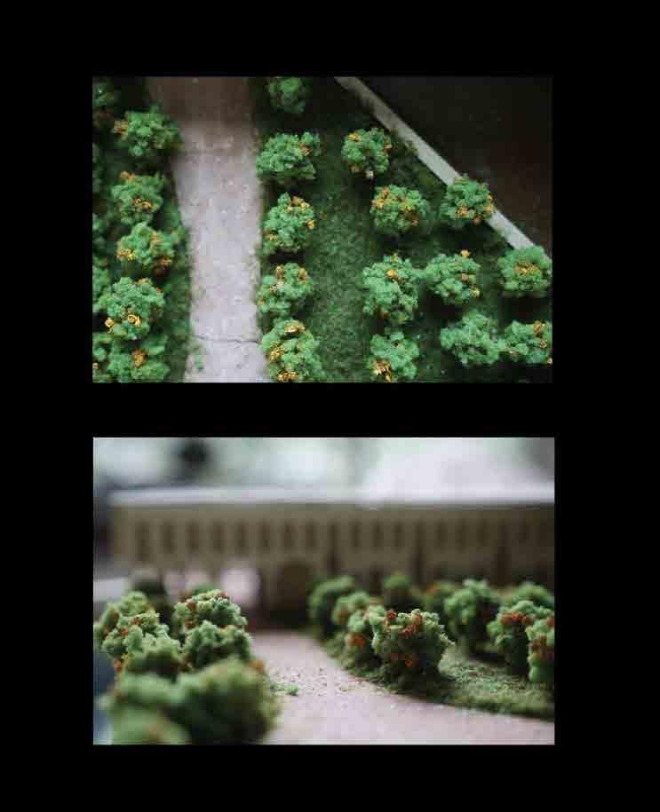 The physical cut the part of the program to show its most features: orange farm and salt farm. Also, how that two agricutural parts interact with the sauqre shape building. That two parts interact the most with the teaching programs and residencial programs, where immigrants take up. The elaborately designed configuration of the frame of salt farm and outshape of orange farm just response to each other in geometric shape. The inner space added arch element. just simplify its space arrangement to be fit into farm.