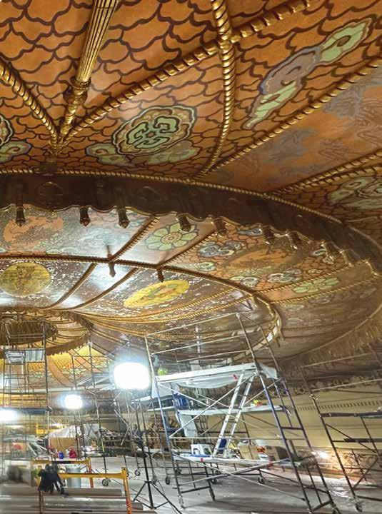 For nearly seven decades, guests at the Castro Theatre were permitted to smoke. For better and worse, the debris from that smoke and other soot accumulated on the signature “tent-like” leatherette ceiling with medallions and intricate sgraffito murals. Throughout the theater, gilded cherubs, organ grilles resembling European palaces, and detailed plasterwork were also covered in the dark matter. There was a major fire at the theater in 1937, which also could have contributed to some of the dirt and sooty debris.
