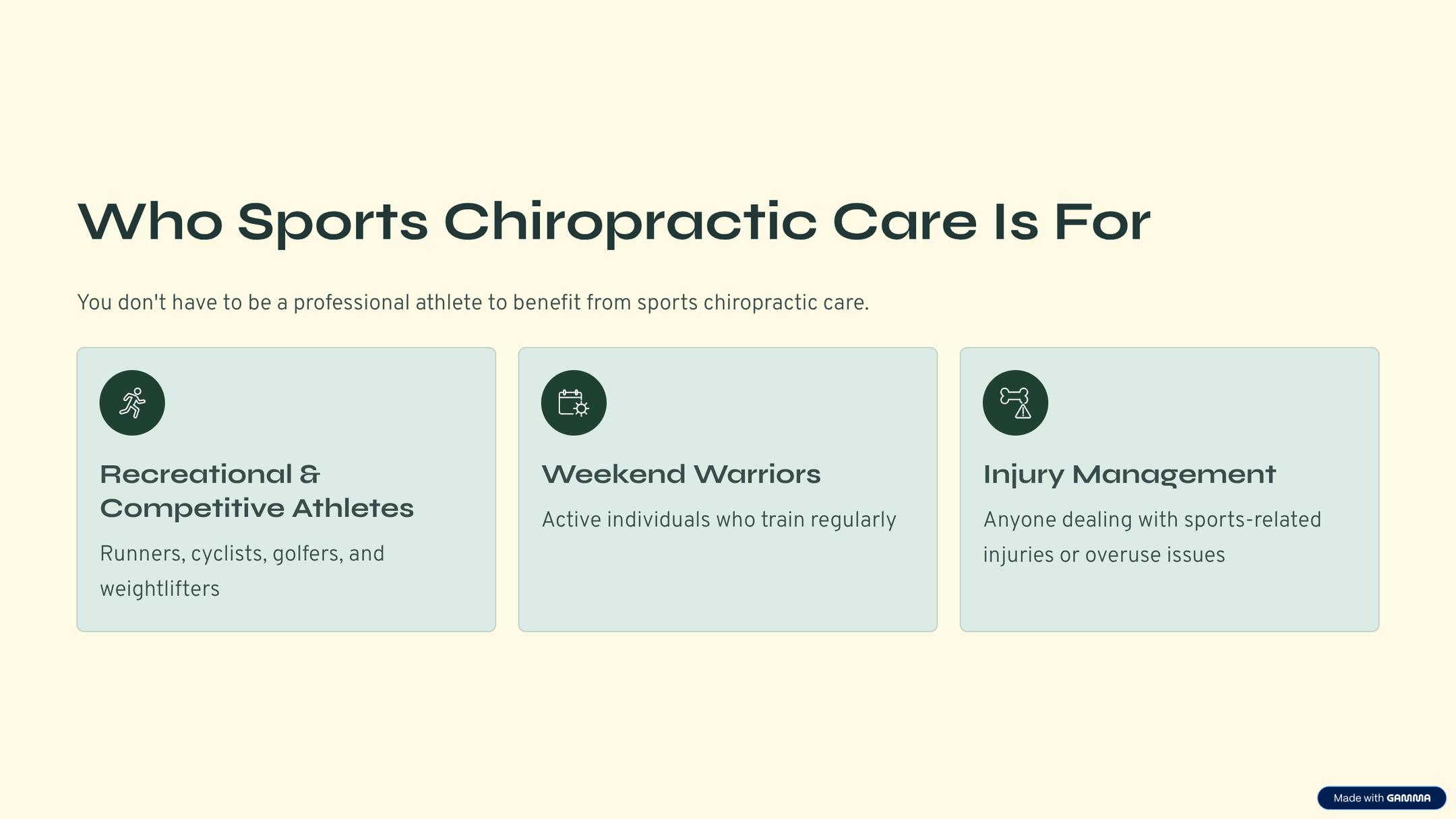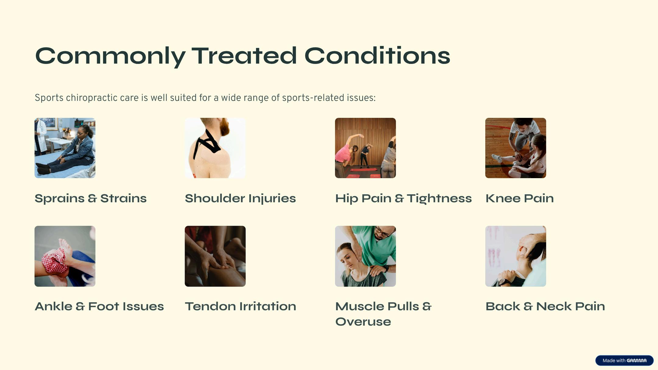 Discover how sports chiropractic care helps athletes and active individuals recover from injuries, improve mobility, and perform at their best. This presentation highlights common conditions treated, hands-on therapies, and movement-focused rehabilitation used to support long-term health and performance. Learn more about this approach to care here: https://sfcustomchiro.com/sports-chiropractic/