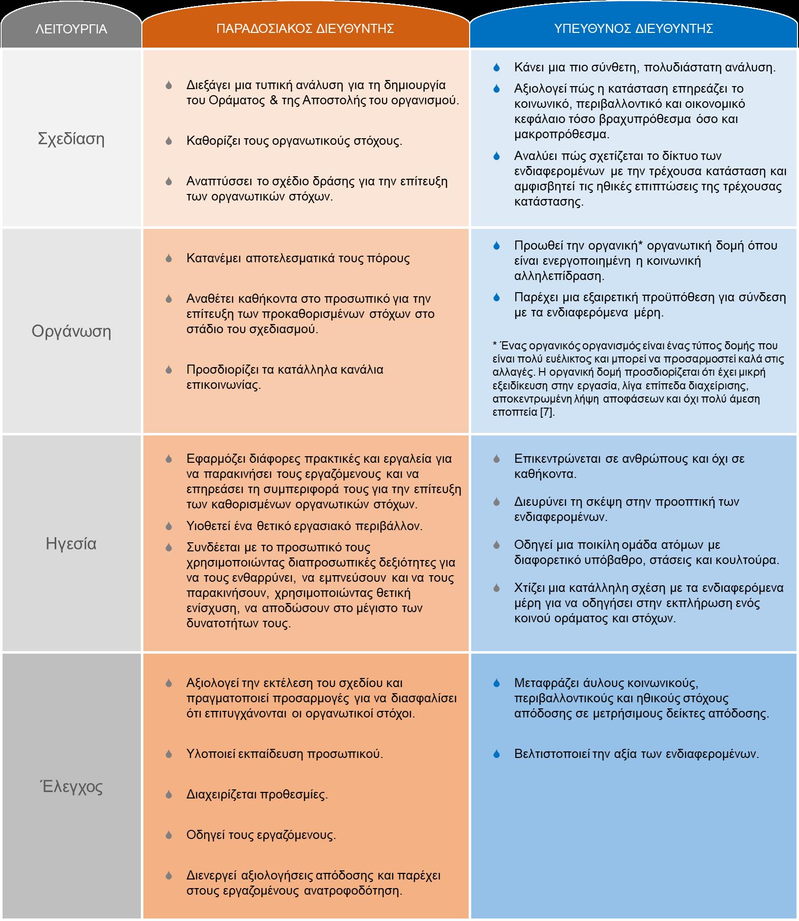 ικανοτήτων. Ένας επιτυχημένος υπεύθυνος διευθυντής απαιτεί ένα νέο σύνολο στάσεων, πεποιθήσεων, δεξιοτήτων και γνώσεων που, σε πολλές περιπτώσεις, είναι πολύ διαφορετικό από το σύνολο που έχει ένας παραδοσιακός διευθυντής