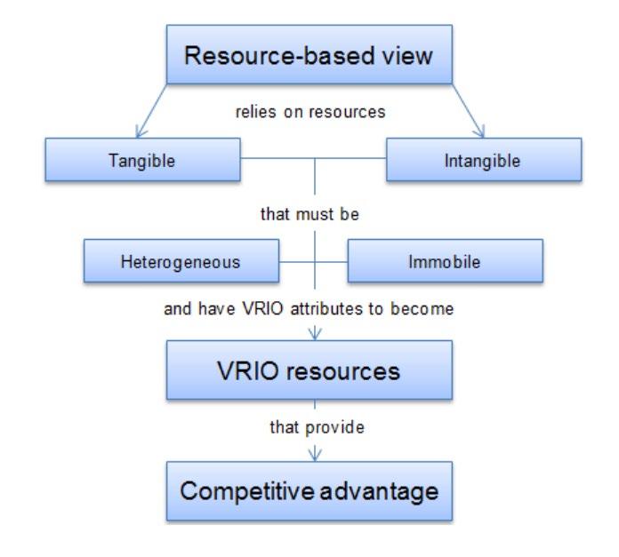 Resource based view argues that resources, both tangible and intangible, must be heterogenous, immobile and have VRIO properties to become VRIO resources VRIO resources result in sustained competitive advantage