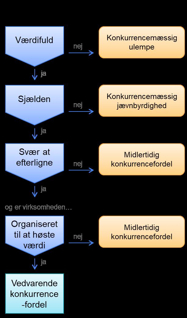 Hvis du kan svare ja på alle fire, har ressourcen VRIO-egenskaber og bør beskyttes og udvikles, fordi VRIO ressourcer sikrer din virksomhed vedvarende konkurrencefordele.