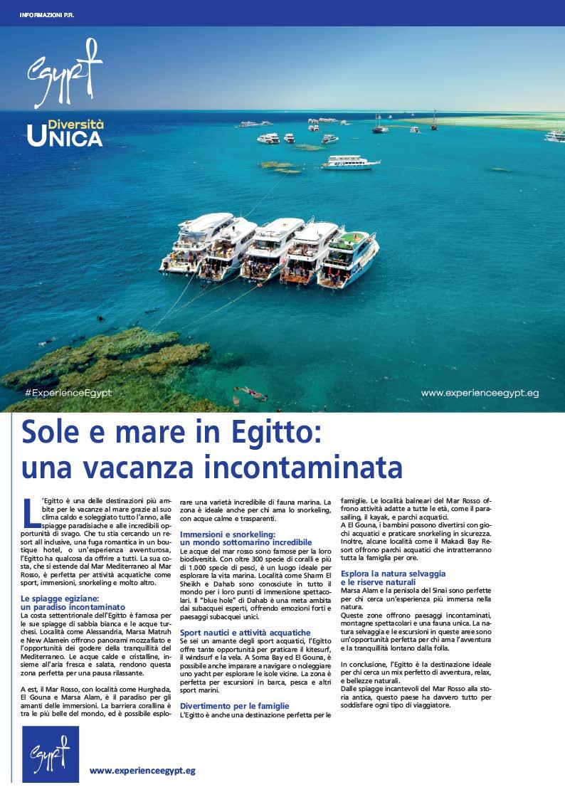 Sulla scia di un evento che ha catturato i riflettori del p a l c o s c e n i c o m o n d i a l e c o m e l ’ a p e r t u r a u f f i c i a l e del Gem - Grand Egyptian Museum (lo scorso novembre) l’industria turistica dell’Egitto ha archiviato il 2025 con un nuovo, significativo incremento del numero di visitatori: ben 19 milioni che rappresentano un incremento del 21% sull’anno precedente Si tratta dell’ennesimo record p e r l a d e s t i n a z i o n e , u n r i s u l t a t o eccezionale che quadruplica la crescita media globale del 5% stimata d a l l ’ O r g a n i z z a z i o n e m o n d i a l e d e l turismo delle Nazioni Unite. La promozione pone l’accento sulle esperienze e sulla qualità dei prodotti, nonché sulla «diversità dell’offerta - come ricordato in più occasioni dal ministro del turismo e delle antichità, Sherif Fathy - che non ha eguali in altre parti del mondo» Dai 3 000 km di costa fra mar Rosso e litorale Mediterraneo, al deserto, alle possibilità per il turismo d’avventura, per l’ecoturismo, che si affiancano alla enorme offerta culturale Non mancano gli itinerari a sfondo gastronomico lungo la valle del Nilo,