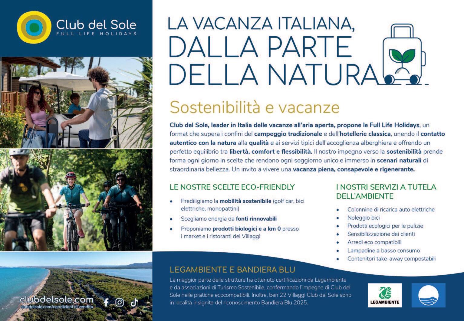«In un mondo in cui l’ospitalità tende ad assomigliarsi, Club del Sole si distingue grazie ad una promessa chiara: offrire una vacanza che unisce libertà e comfort, natura e servizi premium, una formula innovativa che supera i confini del camping tradizionale, da una parte, e dell’hotellerie dall’altra - spiega il direttore generale, Angelo E Cartelli - Con 28 villaggi lungo la Riviera Romagnola, le coste del Tirreno e dell’Adriatico, il lago di Garda e le montagne del Trentino-Alto Adige, il gruppo propone esperienze su misura per coppie, famiglie e viaggiatori con amici a quattro zampe Al centro della proposta del brand c’è il modello di vacanza “Full Life Holidays”, capace di unire comfort