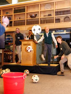 Before Chris ended his remarks, he reminded all those in attendance that Jim’s legacy was also characterized by “a little competitive fun.” With that spirit in mind, Chris introduced an impromptu competition: Jim Leonard Versus the Alumni. Originally planned to have taken place prior to Jim’s retirement, but thwarted by Covid protocols, the three-round competition consisted of three of Jim’s passions: soccer, spelling, and pranks. Jim and Danny Quinn '12 chipped soccer balls into buckets. He and youngest daughter, Campbell '20, went head-to-head in a spelling bee (Campbell was victorious with “junket.”). Finally, Jim’s former assistant, Melissa Fricek, joined him in searching the library for a carefully hidden Jim on the Shelf. The Prep library has rarely been so raucous.