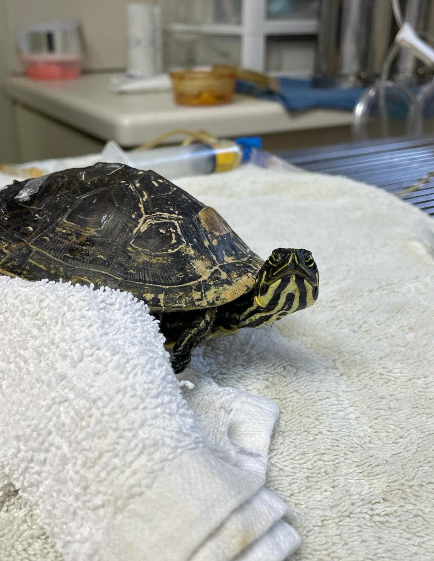 Concerned citizens from Boca Raton transported this Florida Cooter to our hospital when they found the turtle at an intersection with an injury to the shell. An intake exam confirmed fractures along the shell, as well as a right hip fracture. Under anesthesia, clinic staff stabilized the shell fractures using wires to hold the area in place and allow for proper alignment while healing. After three weeks of supportive care, the fractures have begun to stabilize. This patient is currently undergoing supportive care in our Wildlife Ward while the injuries continue to heal.