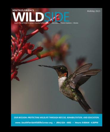 SOUTH FLORIDA’S WILDSIDE South Florida Wildlife Center’s Quarterly Newsletter | Education | Patient Updates | Events Spring 2024 www. SouthFloridaWildlifeCenter.org • (954) 524 - 4302 • Hours: 9:00AM - 4:30PM OUR MISSION: PROTECTING WILDLIFE THROUGH RESCUE, REHABILITATION, AND EDUCATION. SFWC is participating in The Batchelor Foundation Matching Challenge! Learn how you can help wildlife today.
