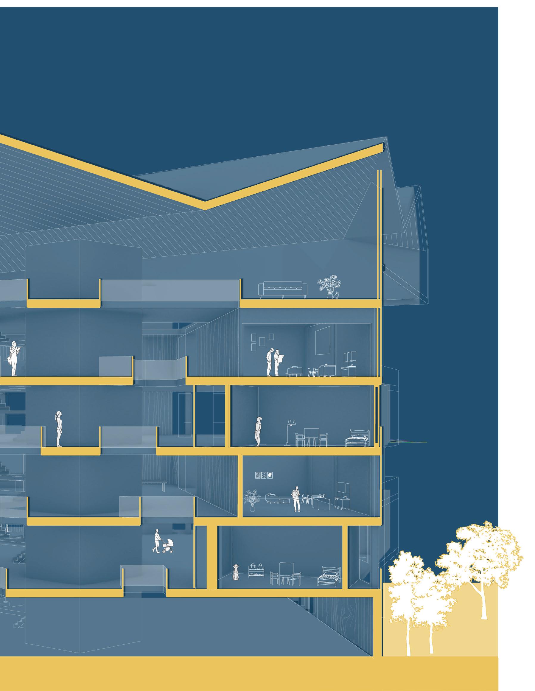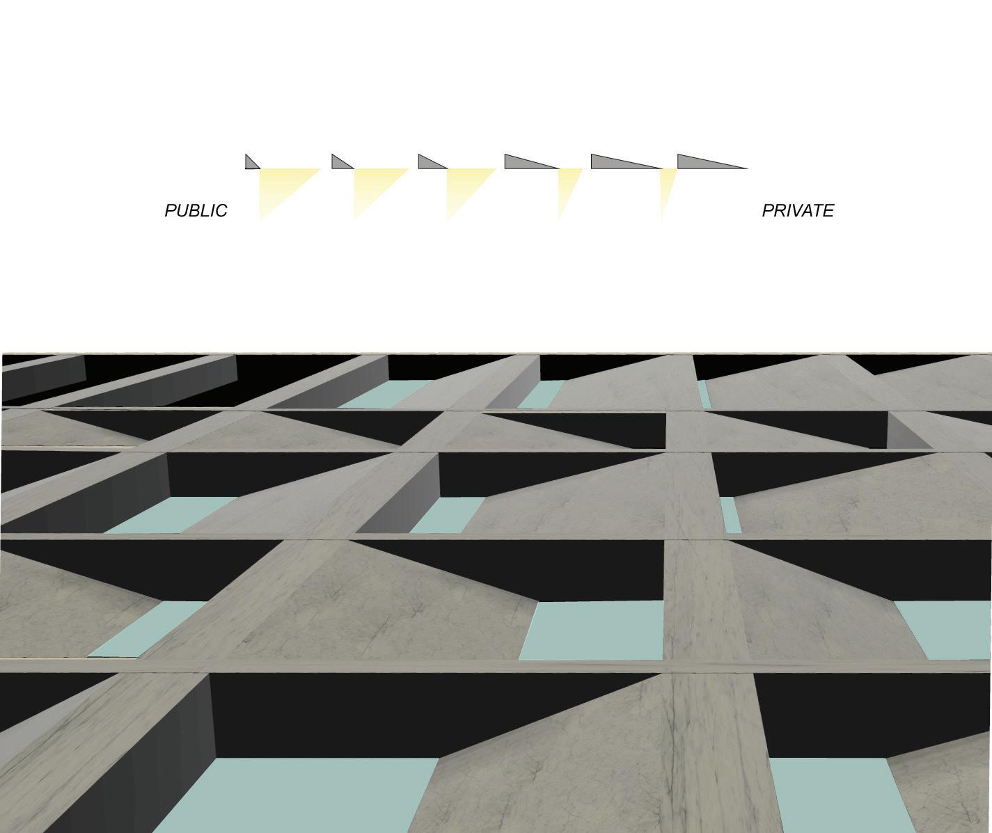 The roof lines control the placement of the modules on the floor plate. The modules fall in between the lines, while the cross sectional area is the public shared space.