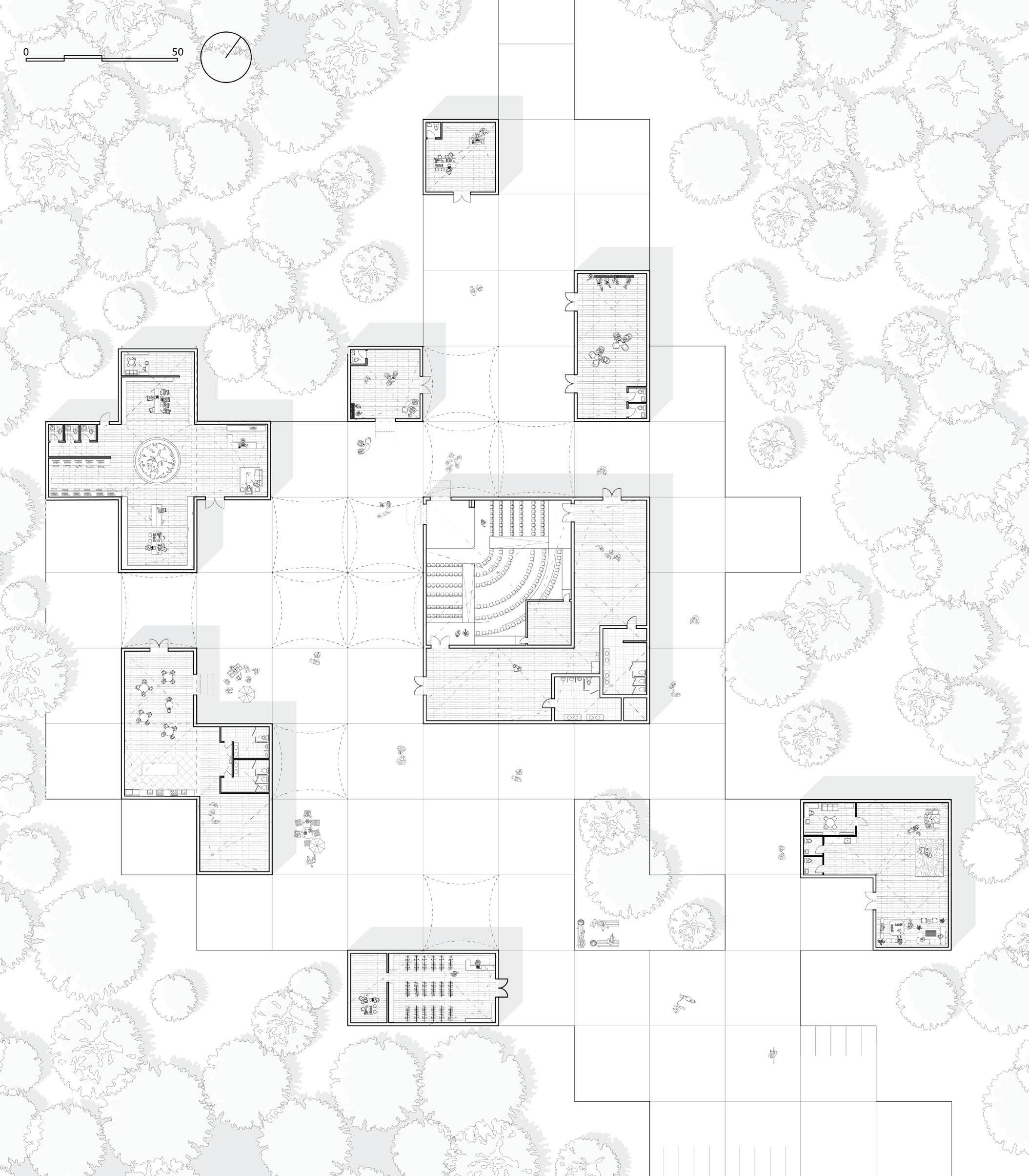 The floor plan of the financial center, shown on the right, illustrates the modular organizational system based on a 25’ x 25’ grid. This grid was carefully aligned with the existing trees and topography, enabling strategic placement of the modules to harmonize with the natural landscape.