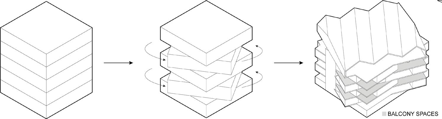While researching ramping styles, 1111 Lincoln Road became the key precedent for my design. The combination of three different ramp styles defines the building’s levels, allowing for varied interactions and programs. The three main shear walls divide the structure, while subtle, sheared walls peel off from the bearing walls, forming smaller private spaces. This peeling concept is carried through to the façade, where the angle determines window size—larger for public spaces and smaller for private ones. The wavelike facade creates unique interior lighting, highlighting the program’s transitions between public and private areas.