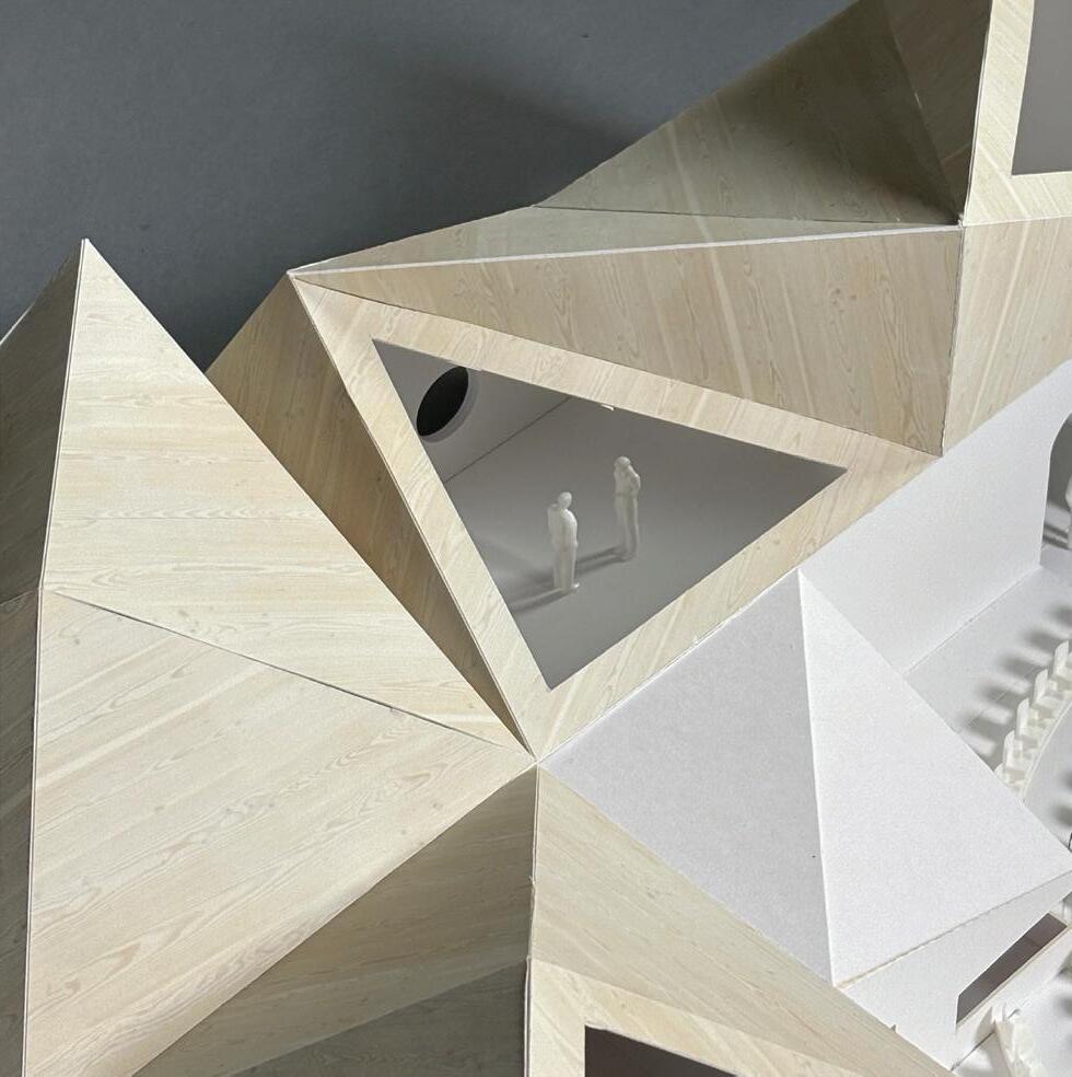The physical model was constructed using foam core, with a printed texture sheet applied to mimic the appearance of wood. This design choice highlights how the varying roof angles of the modules converge to filter natural light into the building. The model focuses on the auditorium, the campus’s central hub, showcasing its versatility for multiple programs and activities. This space is integral to fostering community engagement and supporting diverse uses within the modular design.