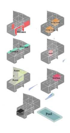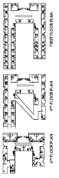 In designing the plans of this complex, An effort was made to divide the private rooms of each unit from the public spaces by using a wall.The size of the units on 昀氀oors 5 and 6 are greater than the other 昀氀oors .