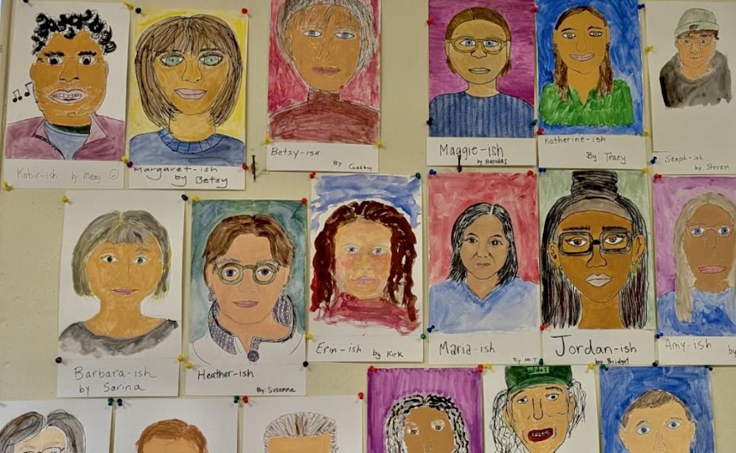 Like our youngest students, we have crafted puppets to explore three dimensional selfportraiture. We have played on the playground to examine what it feels like during recess, and to think about how it strengthens our oversight as teachers on recess duty. We have created wooden creatures out of found materials, exploring creativity and resourcefulness. We have learned to knit hats, mimicking the experience that each fifth grader goes through. Recently, we painted ish portraits, turning our lens outward to paint a portrait of a colleague that involved being in conversation around identity.