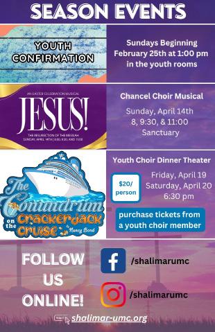 March 30 | 9:00 am – 11:00 am. All are invited to join us as we celebrate the Resurrection of Jesus! Festivities will include food, fellowship, Easter egg hunts, inflatables, and activities for the children. For those willing and able to serve, contact Sarah Hicks at sarah@shalimar-umc.org. We are now collecting donated individually wrapped candy in the FLC or office. Thank you for your faithfulness to serve the children and families in our community!