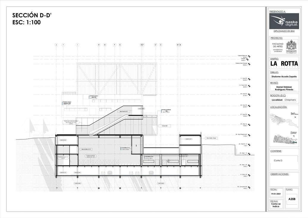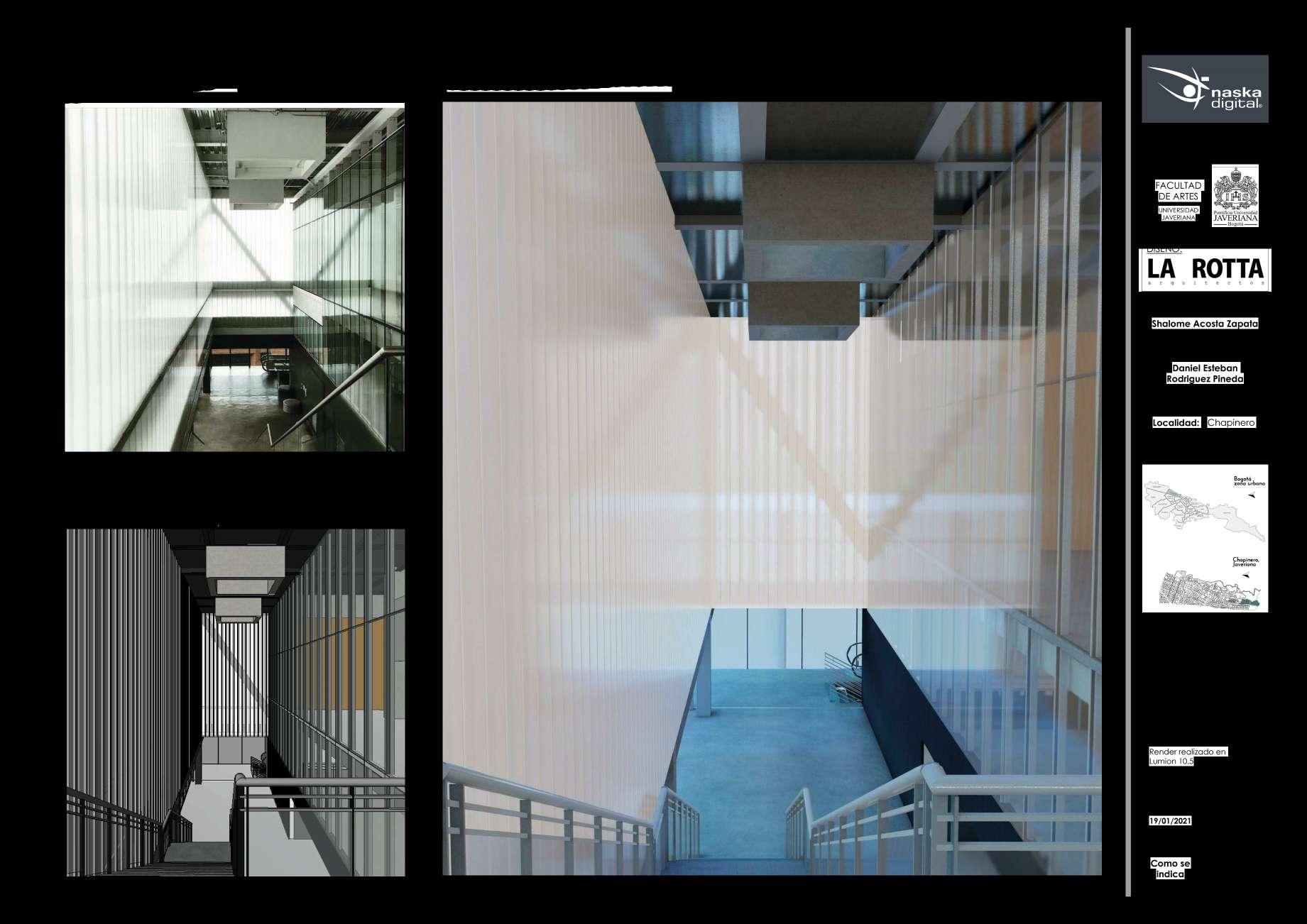 Ce projet est un exercice académique réalisé dans le cadre d’un programme de formation en BIM. Il ne s’agit pas d’une conception personnelle, mais d’une réinterprétation numérique du bâtiment existant de la Faculté des Arts de l’Université Javeriana à Bogotá, conçu par La Rotta Arquitectos et inauguré en 2015.