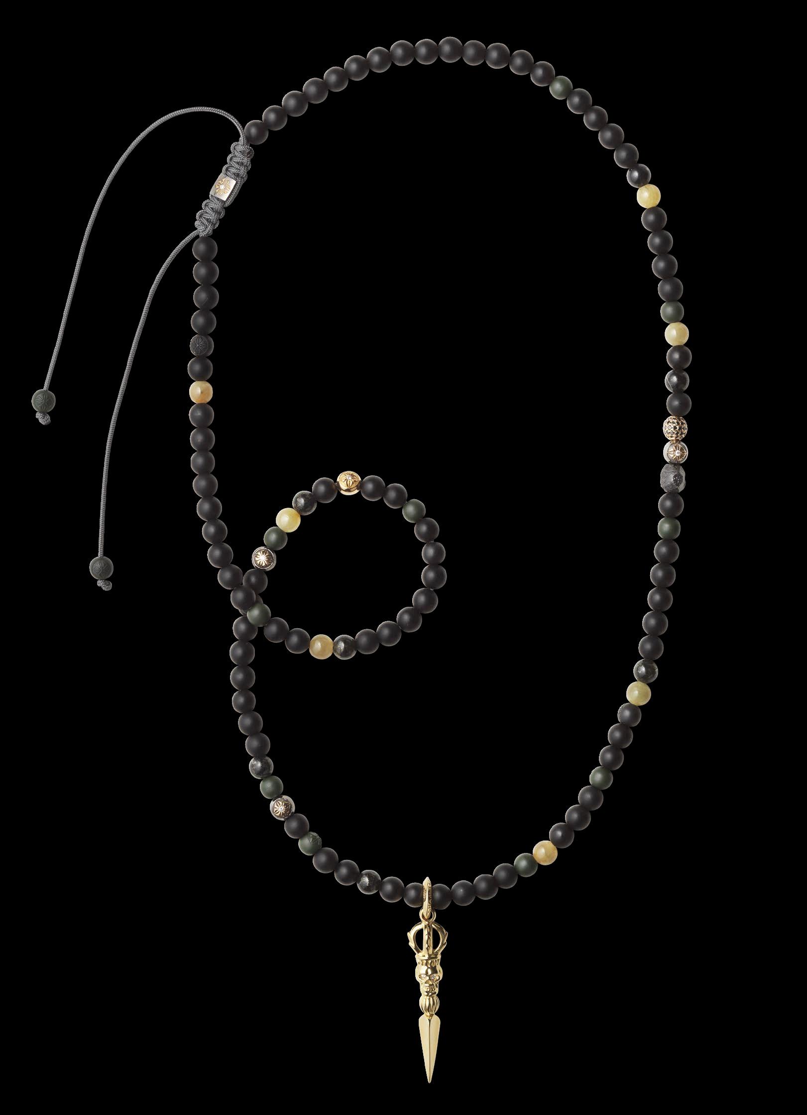 SHAMBALLA® Necklace with Laughing Skull Phurpa Pendant | G/Vs & Black Diamonds, Rough Black Diamond, Yellow Sapphires, Black Jades, Black & Green Matte Ceramic, 18K Yellow & Black Rhodium Plated Yellow Gold