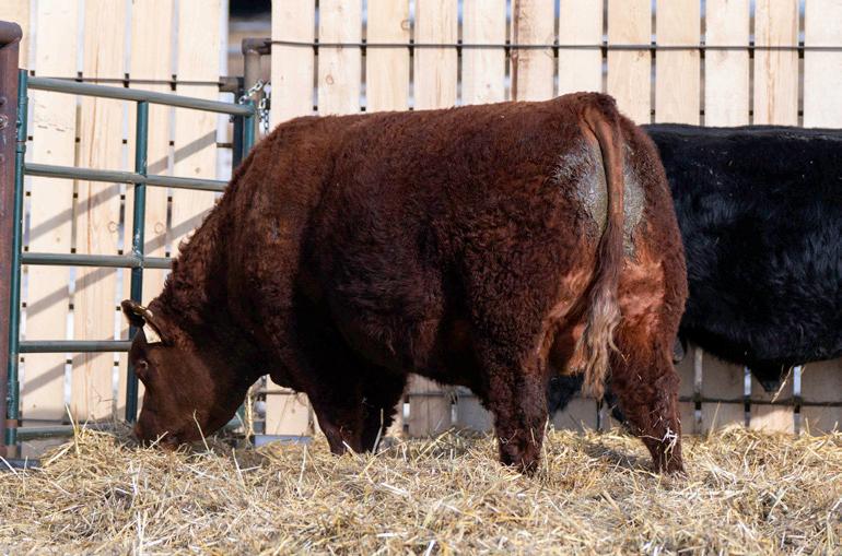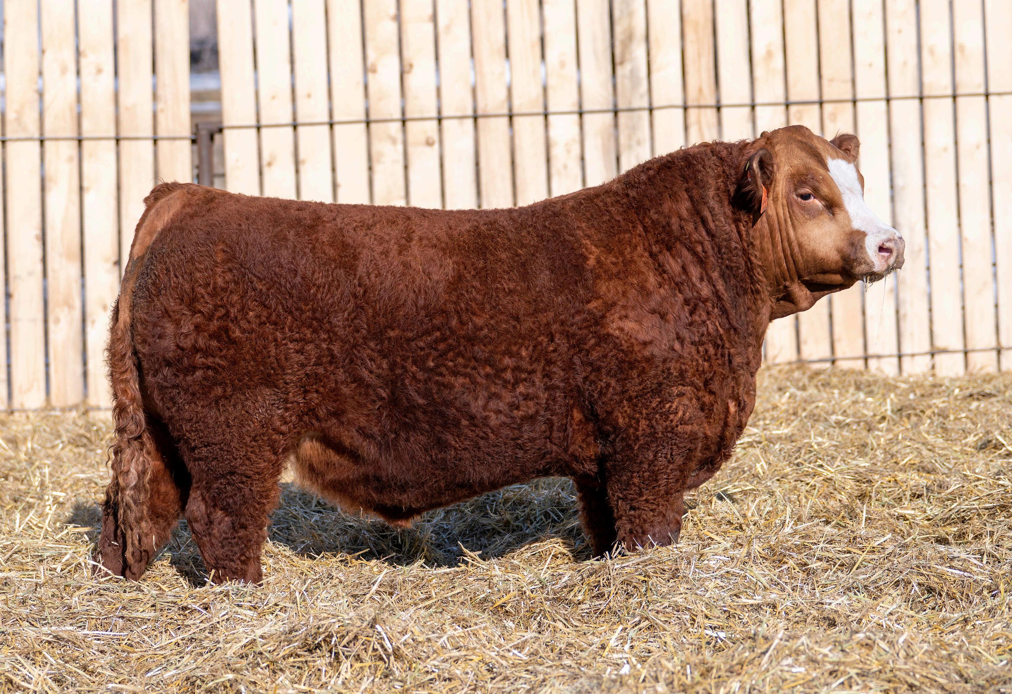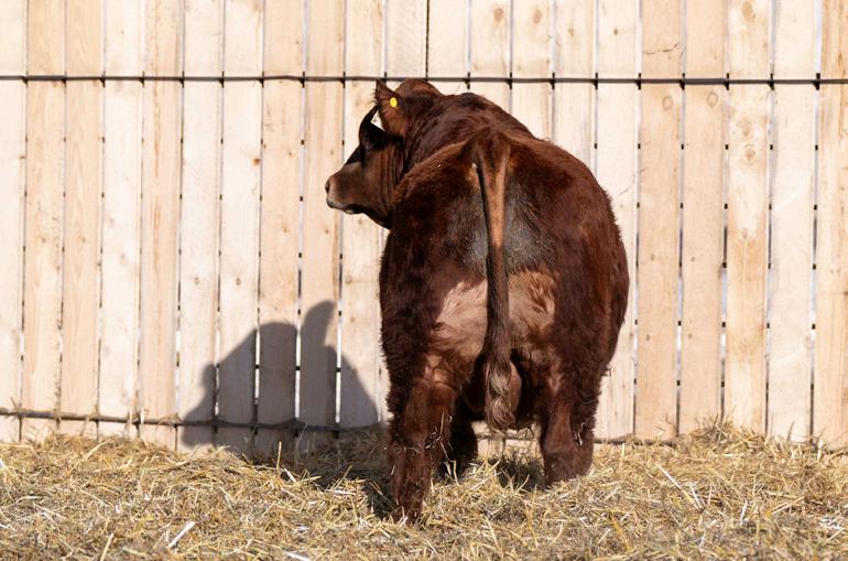 3M is a stretched-out, red bull with a strong foot set and correct structure. He’s developed well, showing good muscle expression, balance, and the potential to mature into a solid, high-performing herd sire