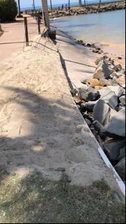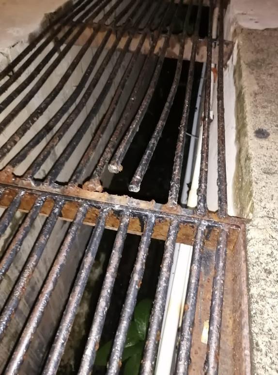 Drain grille broken off (located at front of staff entrance), which can be a tripping hazard or possible impalement.