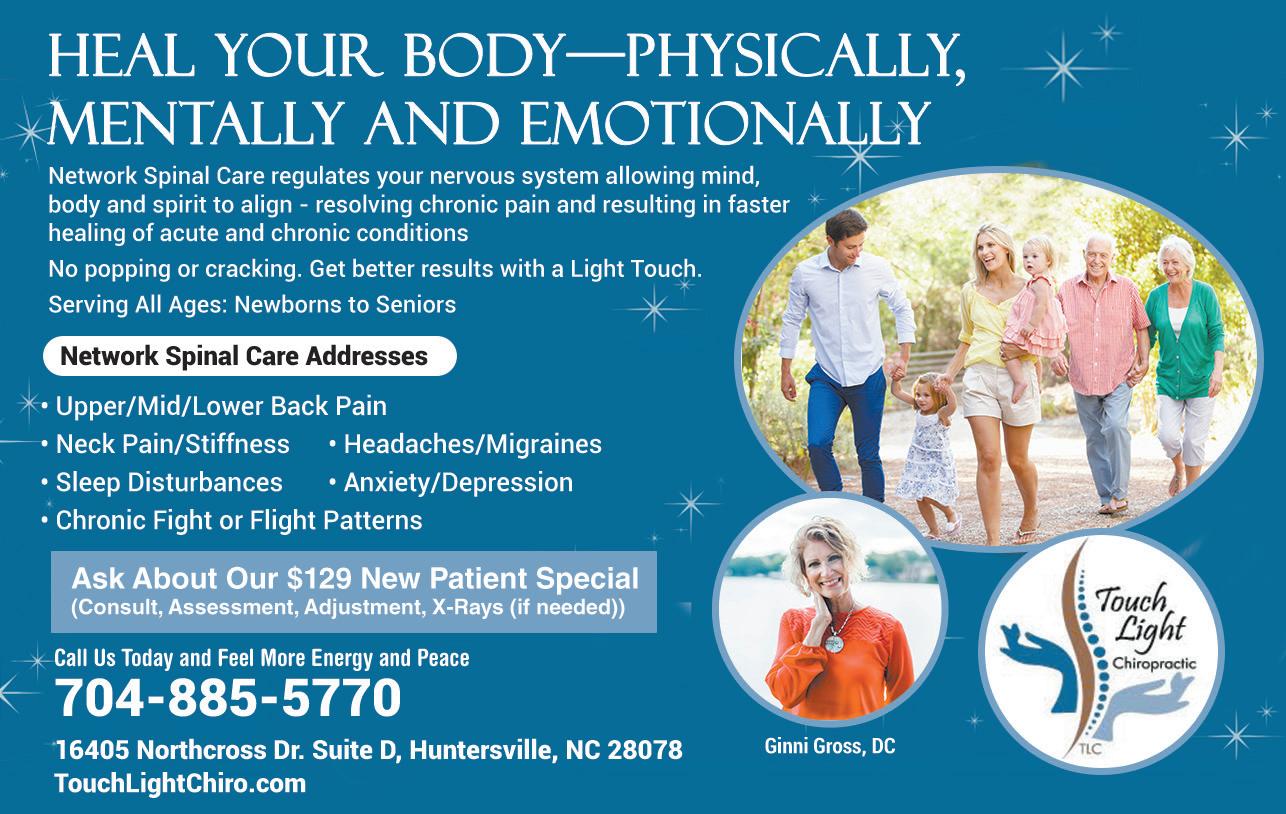 Ginni Gross, DC and certified NSC Practitioner, is the owner of Touch Light Chiropractic located at 16405 Northcross Dr., Ste. D, in Huntersville. For more information, to make an appointment or to register for a free monthly Breathwork or Aligned Wellness workshop, call 704885-5770, email DrGinni@TouchLightChiro.com or visit TouchLightChiro.com.