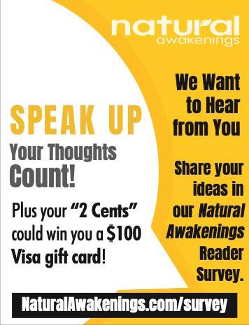 The Natural Awakenings Charlotte online readership survey allows us to better serve readers. “Your participation takes just five minutes and will give us a better understanding of how well we’re delivering on your expectations,” says Charlotte publisher Shannon McKenzie. “We’ll use your responses to help guide our future development.” One participant, selected at random, will receive a $100 Visa gift card. The survey deadline is March 25, and the winner of the gift card will be announced shortly thereafter.