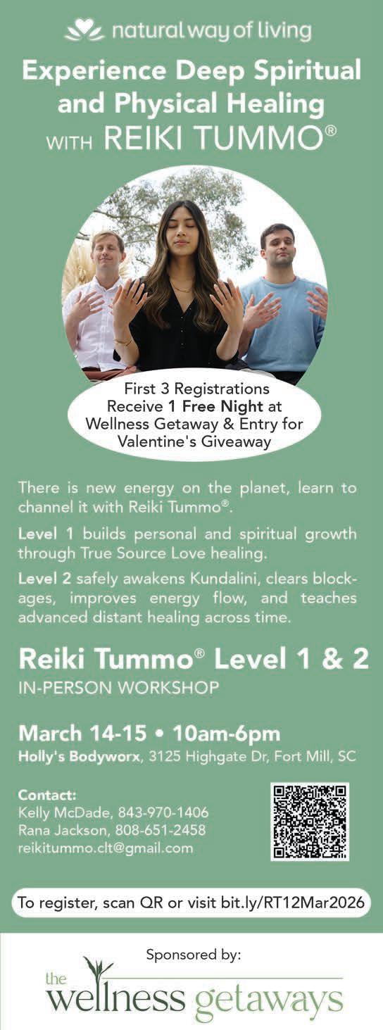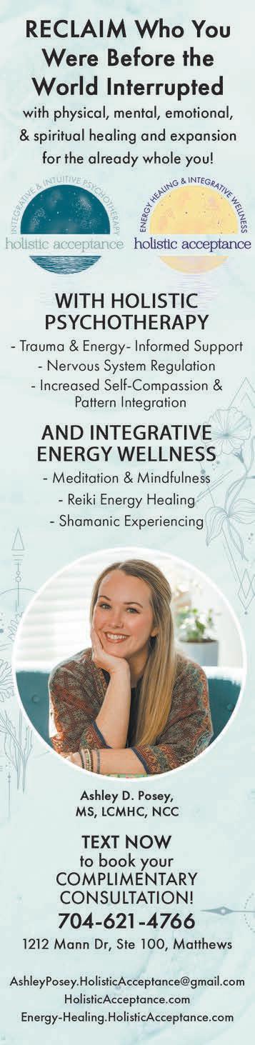 Cost: $111. Spaces are limited to ensure a supportive, intimate experience. Event location: 17210 Lancaster Hwy., Ste. 401, Charlotte. For more information, to register for the event or make an appointment, call/text 704-621-4766, email AshleyPosey.HolisticAcceptance@gmail.com or visit HolisticAcceptance.com or Energy-Healing.HolisticAcceptance.com. See ad, page 11.