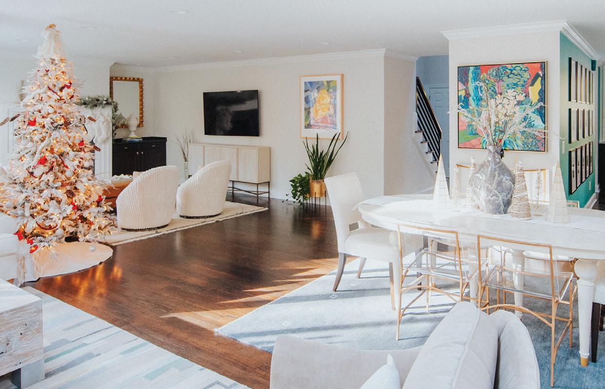 The house, situated on just over two acres, was originally built in the ’80s and had a significant addition in 2011. The couple gutted the kitchen, remodeled the living areas and completely redid the home’s attached apartment. They also added on a breezeway (that leads to a new twostory garage complete with a fitness center on the upper level) and created a fire pit area in the backyard.