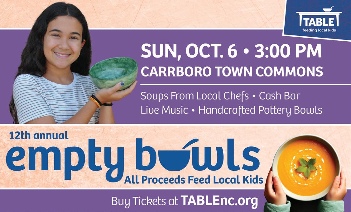 Join Table for its 12th annual fundraiser at the Carrboro Town Commons, featuring dinner and desserts, as well as live music and your choice of a handcrafted bowl made by local artists. This year, the organization hopes to exceed last year’s proceeds of $350,000, furthering its efforts to provide healthy meals to the children of Orange County.