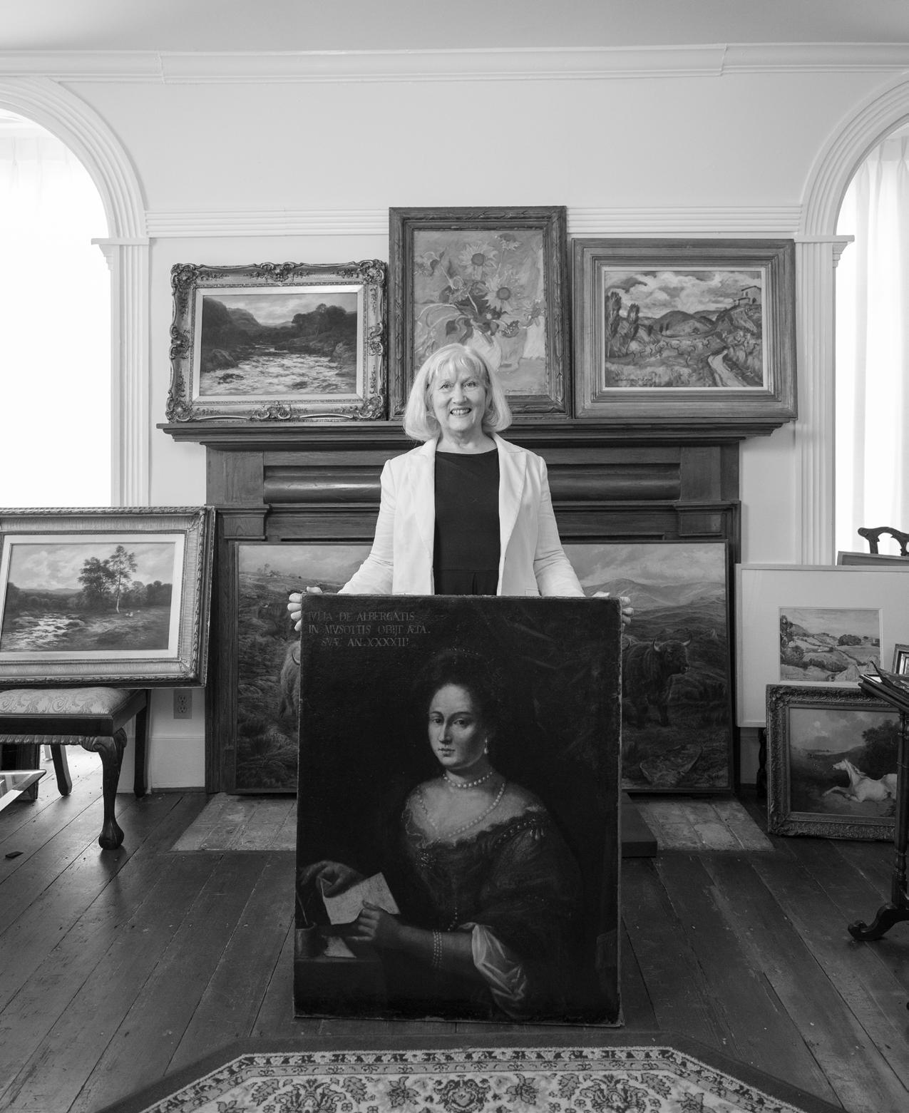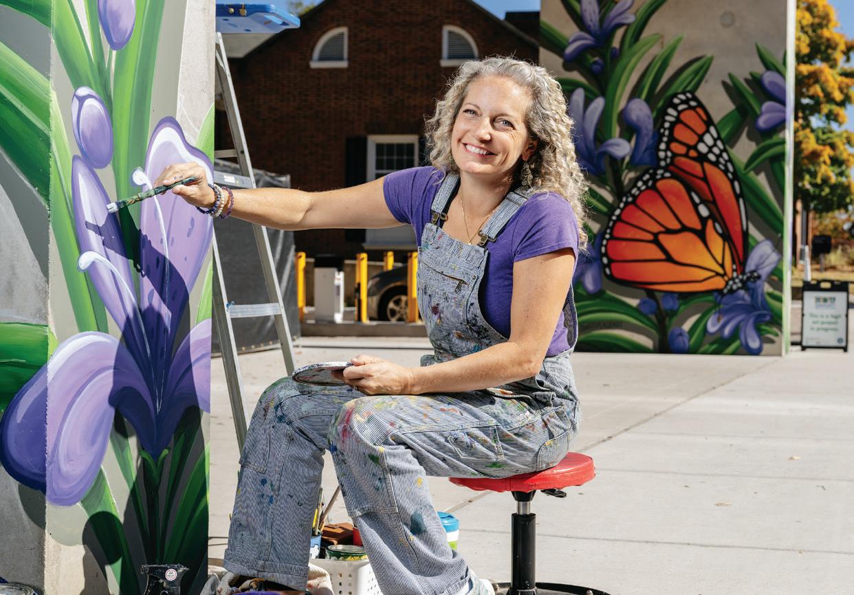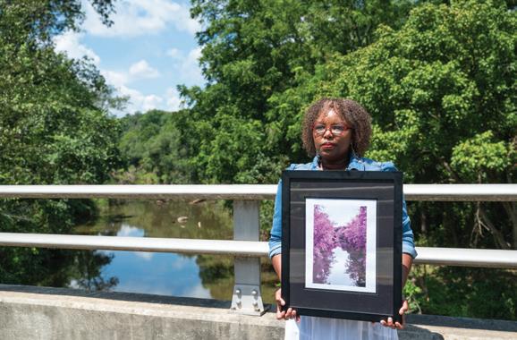 Artist Tiffney Marley stands on a bridge on Eno Mountain Road overlooking the Eno River in Hillsborough, where she took a photograph that inspired the artwork she’s holding, titled “Eno Flourish.” She transformed the image into an illustration, which she digitally colored to impart an otherworldly beauty. CHM