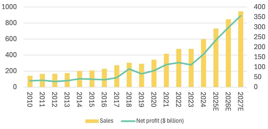 investment perspective for two reasons. First, by dint of their ubiquity, silicon chips offer a good insight to global economic activity. Global sales have risen by around 8% on a compound annual basis over the last forty-odd years, but with some big booms and busts along the way. Worldwide sales are expected to grow by 11% and reach nearly $700 billion in 2025 and semiconductors are everywhere, from tablets to laptops, cars to robots, smartphones to servers and smart meters to medical equipment.