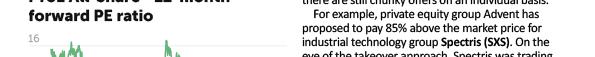 For example, private equity group Advent has proposed to pay 85% above the market price for industrial technology group Spectris (SXS). On the eve of the takeover approach, Spectris was trading on 12.7 times next 12 months’ earnings. It had gone through a bad patch, leaving it vulnerable to an opportunistic bid. This stock has regularly traded between 16 and 20-times forward earnings over the past 10 years.