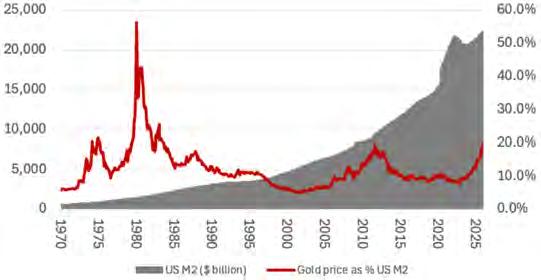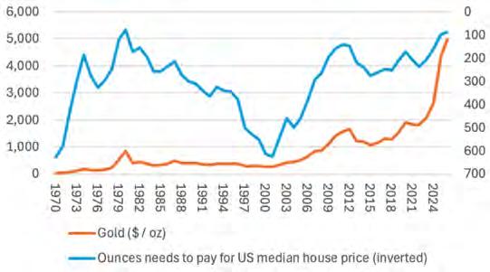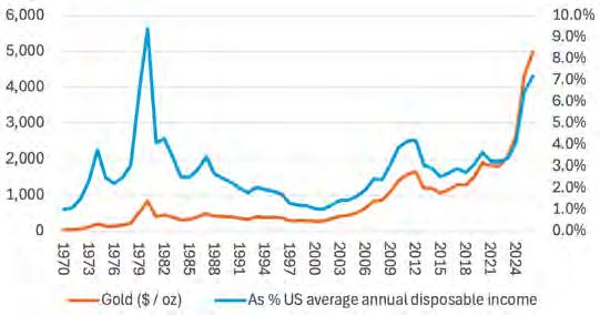 One approach is to look at how the gold price compares to annual disposable income. When gold peaked at $835 an ounce in January 1980, it reached 9.4% of the annual US household’s available annual discretionary spending. Gold currently stands at 7.2% of that figure, and a return to the former high points to a gold price of some $6,500 an ounce, or a third above current levels. Asset and wage inflation (or deflation) could shape this calculation going forward.