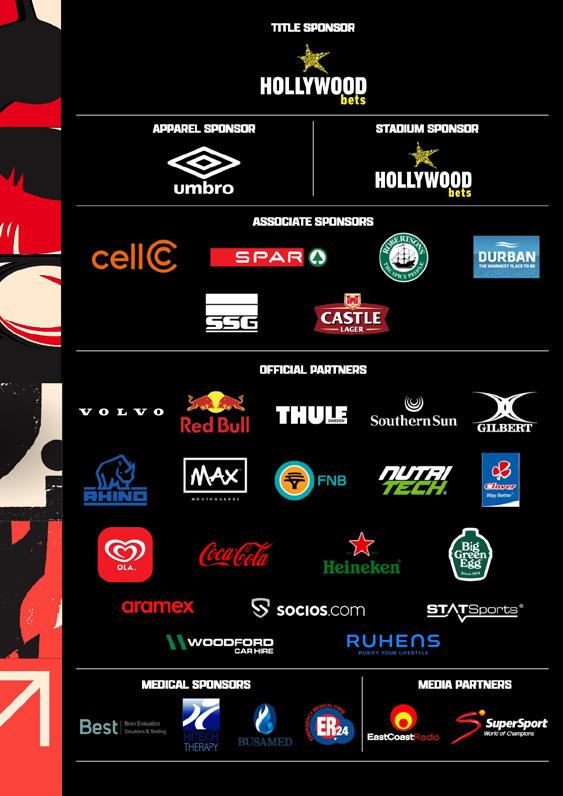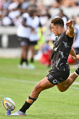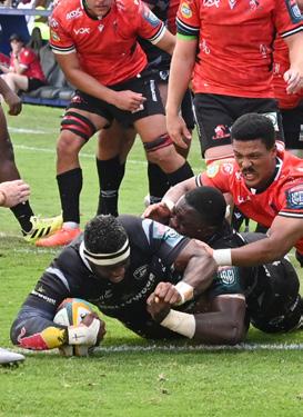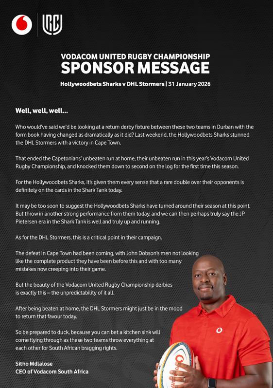 More speed and movement from the Hollywoodbets Sharks enabled 20-yearold whiz-kid, Jaco Williams, to run in another try for the men in black to go into halftime 17-12 up. The hard-grafting Phepsi Buthelezi recorded a third shortly after