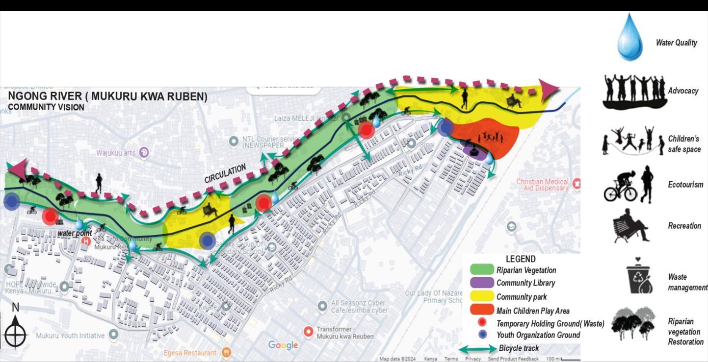 The assignment of the project is to develop an innovative community- led River’s riparian design, that enhances climate resilience and improved quality of life through Nature Based solutions and Green Gray Infrastructure approaches. This will focus on Ngong’ River riparian zone, along Mukuru kwa Reuben Segment 2 settlement. Kwa Reuben segment 2 is in Mukuru kwa Reuben settlement, its neighborhood being Viwandani, Kwa Njenga and segment 1. Along it is River Ngong, which has a 30m riparian, consisting of a temporary children playground, a temporary waste holding ground and also parts vulnerable to floods as seen below. Under this segment, there is the need of proper and sustainable solutions and safe spaces for the community.