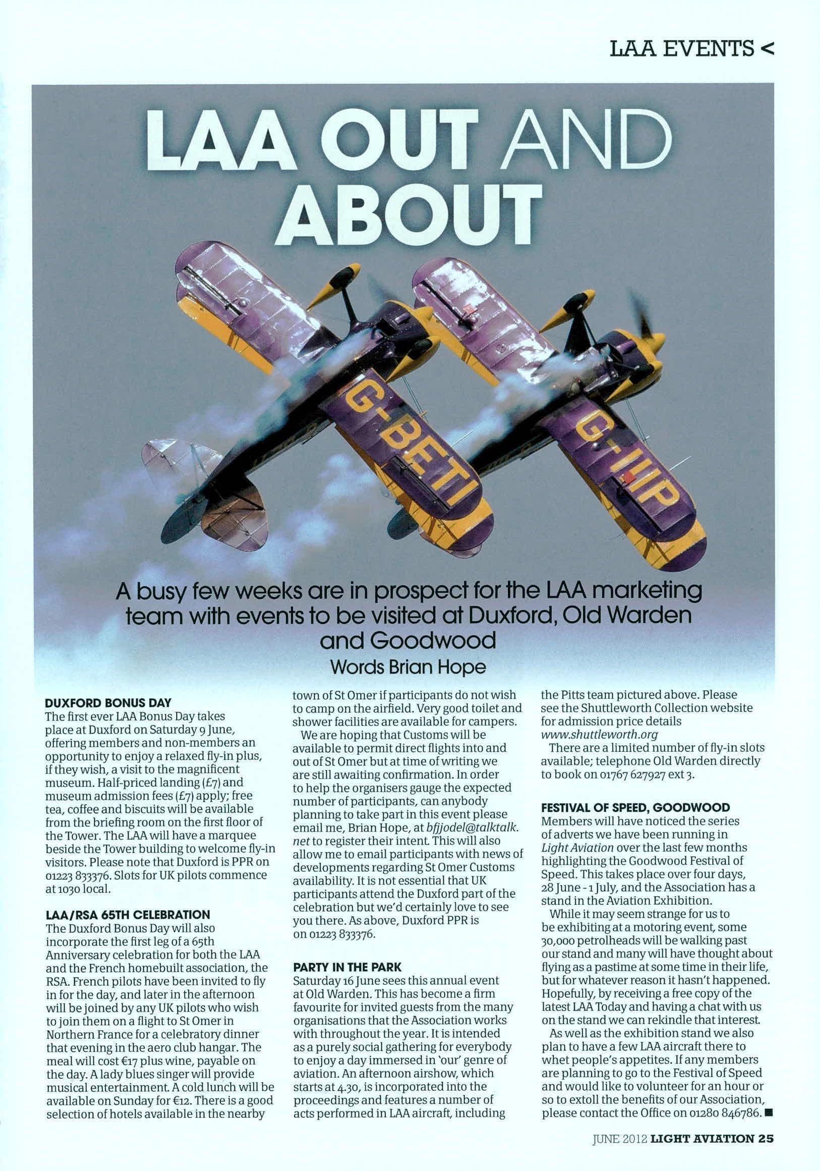 MEMBERSPROMOTELAA Theeventseasonisnowwellandtrulyupon us,havingstartedwiththeMicrolightShowat Popham,andinlateMayAeroExpoatSywell,both importantdatesintheLAAcalendar.Itisherethat thegenerosityandhelpfulnessshinesthroughas wepulltogethergroupsofvolunteersandaircraft forwhatareveryworthwhileandengagingevents. Withmoreeventsplanned,andaneedforthe LAApresencetobepromotedthroughoutthe CAcommunity,we'llbelookingforwardtothe contributionofourvolunteersevenmore,soifyou feelyouhavethetimeandsomethingtoofferthe Association,thenpleaseletusknow. Theysayitisalwayseasiertobe negativethanpositivebecausethatway, oneisneverdisappointed,buttheyalso sayittakeslessefforttosmilethanto frown,sodespitetheproblems,what weintheLAAofferisthesilverliningto thosegreyclouds,andforthosewhose passionisinaviationtoreallybeableto enjoyitaffordably.Letusallteakeheart, summeratlastseemstohavearrived. Let'sspreadtheLAAmessageasthe morememberswecanget,themorewe canachieve.